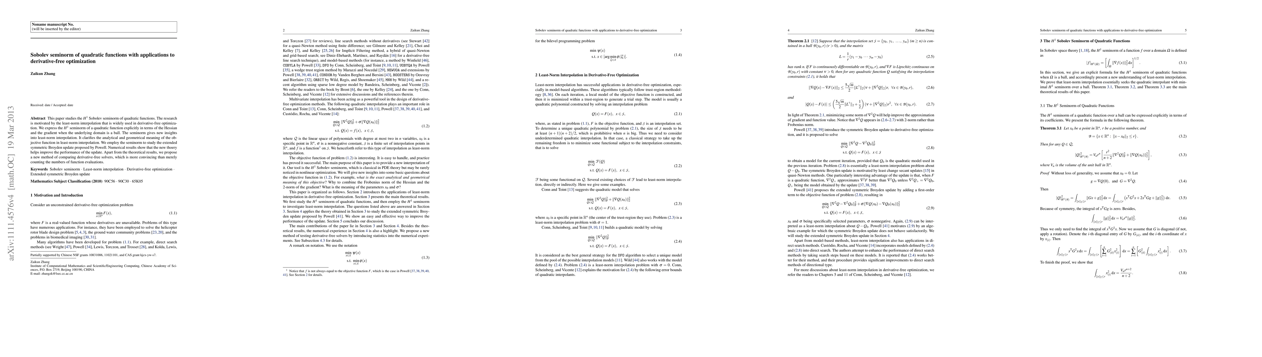 This paper derives the $H^1$ Sobolev seminorm for quadratic functions, providing insights into least-norm interpolation in derivative-free optimization. The study shows improved performance of the extended symmetric Broyden update using the proposed seminorm and introduces a new method for comparing derivative-free solvers beyond function evaluation counts.