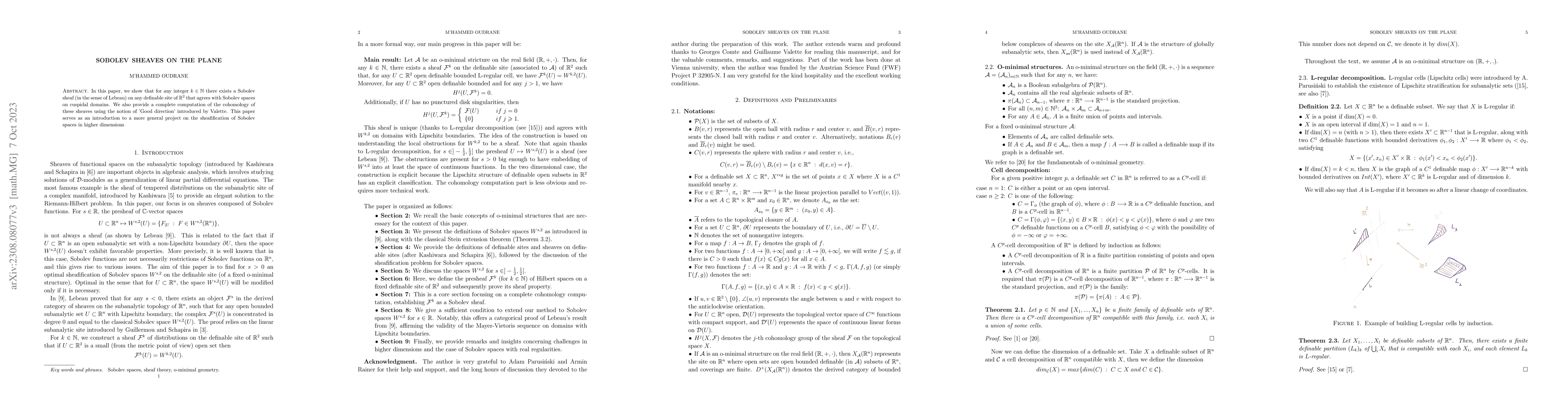 In this paper, we show that for any integer $k \in \mathbb{N}$ there exists a Sobolev sheaf (in the sense of Lebeau) on any definable site of $\mathbb{R}^2$ that agrees with Sobolev spaces on cuspidal domains. We also provide a complete computation of the cohomology of these sheaves using the notion of 'Good direction' introduced by Valette. This paper serves as an introduction to a more general project on the sheafification of Sobolev spaces in higher dimensions.