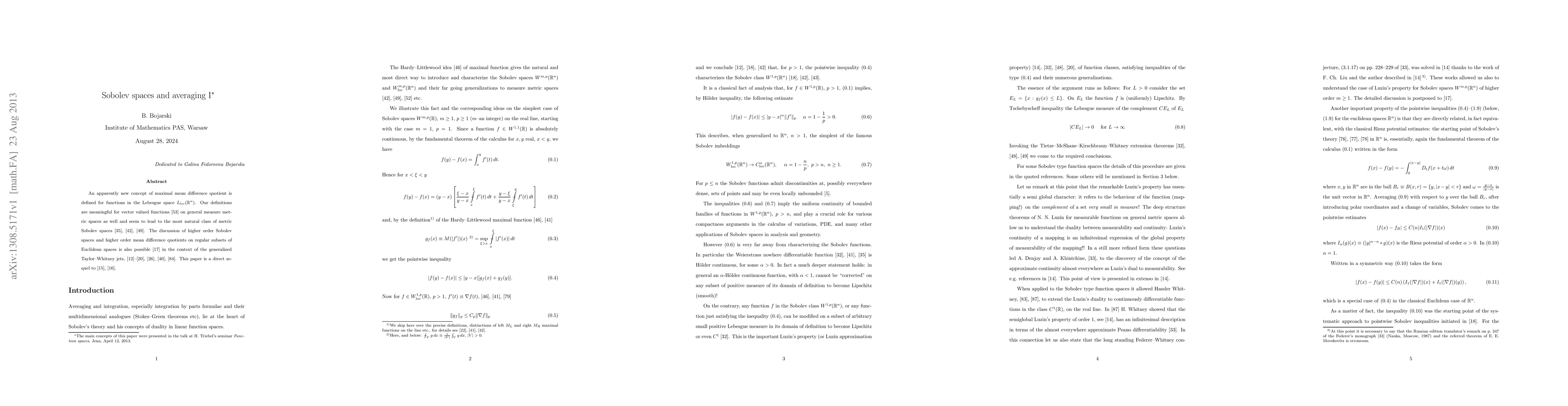 An apparently new concept of maximal mean difference quotient is defined for functions in the Lebesgue space $L_{loc}(R^n)$. Our definitions are meaningful for vector valued functions on general measure metric spaces as well and seem to lead to the most natural class of metric Sobolev spaces. The discussion of higher order Sobolev spaces and higher order mean difference quotients on regular subsets of Euclidean spaces is also possible in the context of the generalized Taylor-Whitney jets. This paper is a direct sequel to the papers: B. Bojarski, Taylor expansions and Sobolev spaces, Bull. Georgian Natl. Acad. Sci. (N.S.) 5 (2011), no. 2, 5-10. B. Bojarski, Sobolev spaces and Lagrange interpolation, Proc. A. Razmadze Math. Inst. 158 (2012), 1-12.