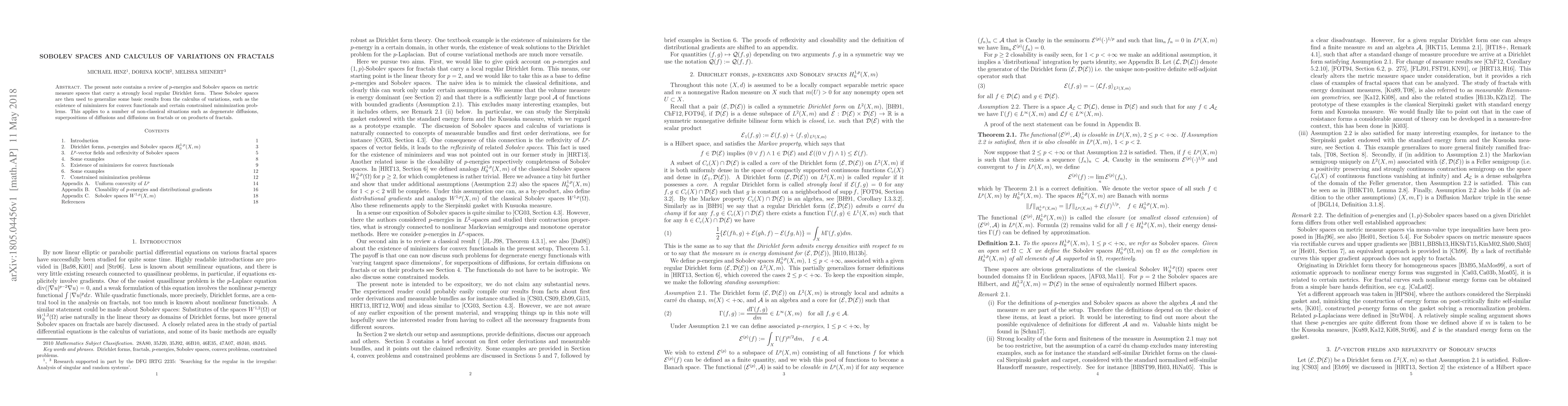 This paper reviews Sobolev spaces and $p$-energies on metric measure spaces with a regular Dirichlet form, extending calculus of variations results to fractals and non-classical diffusion scenarios. It establishes the existence of minimizers for convex functionals and constrained minimization problems in these settings.