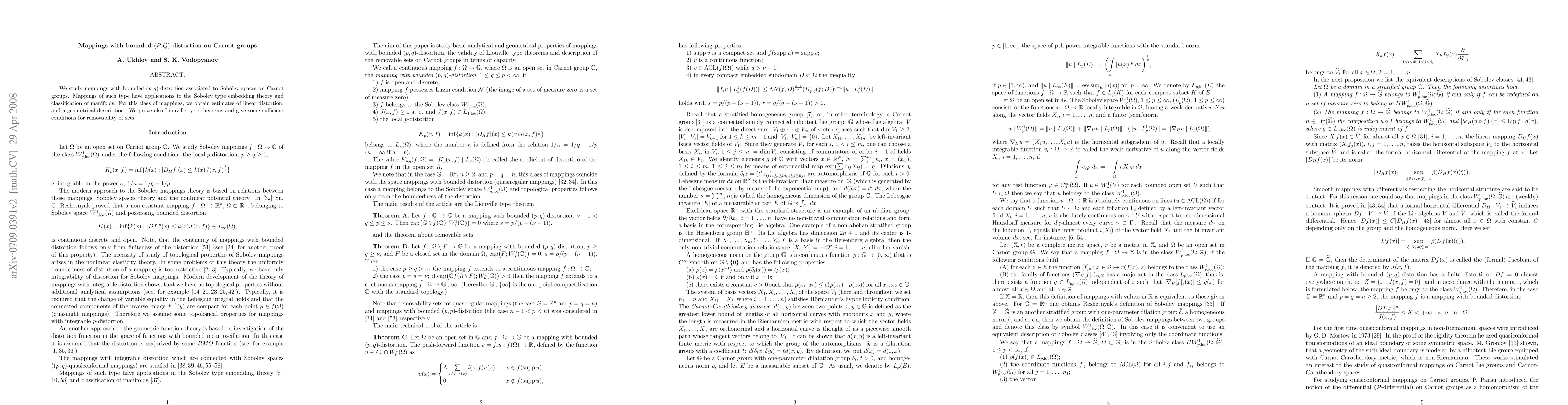 This paper investigates mappings with bounded (p,q)-distortion in Sobolev spaces on Carnot groups, providing estimates of linear distortion and a geometrical description. It also proves Liouville type theorems and discusses sufficient conditions for the removability of sets.