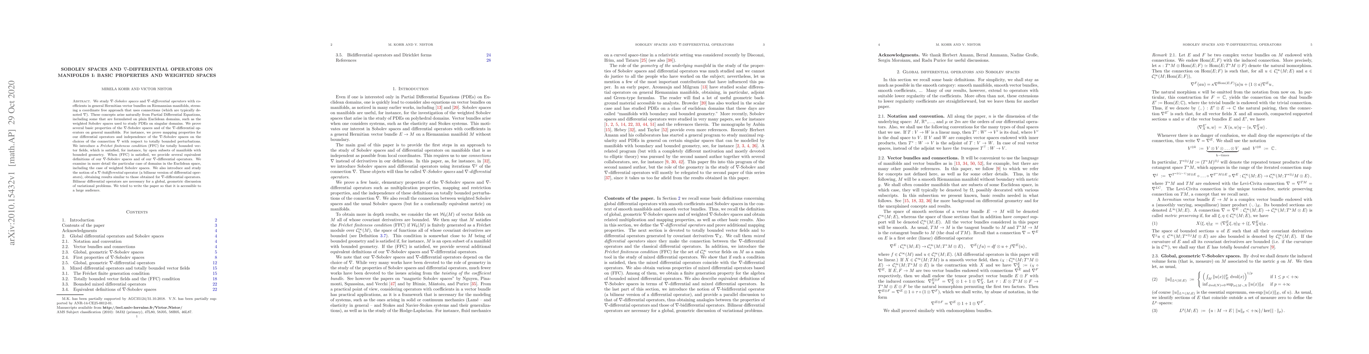 We study {\em $\nabla$-Sobolev spaces} and {\em $\nabla$-differential operators} with coefficients in general Hermitian vector bundles on Riemannian manifolds, stressing a coordinate free approach that uses connections (which are typically denoted $\nabla$). These concepts arise naturally from Partial Differential Equations, including some that are formulated on plain Euclidean domains, such as the weighted Sobolev spaces used to study PDEs on singular domains. We prove several basic properties of the $\nabla$-Sobolev spaces and of the $\nabla$-differential operators on general manifolds. For instance, we prove mapping properties for our differential operators and independence of the $\nabla$-Sobolev spaces on the choices of the connection $\nabla$ with respect to totally bounded perturbations. We introduce a {\em Fr\'echet finiteness condition} (FFC) for totally bounded vector fields, which is satisfied, for instance, by open subsets of manifolds with bounded geometry. When (FFC) is satisfied, we provide several equivalent definitions of our $\nabla$-Sobolev spaces and of our $\nabla$-differential operators. We examine in more detail the particular case of domains in the Euclidean space, including the case of weighted Sobolev spaces. We also introduce and study the notion of a {\em $\nabla$-bidifferential} operator (a bilinear version of differential operators), obtaining results similar to those obtained for $\nabla$-differential operators. Bilinear differential operators are necessary for a global, geometric discussion of variational problems. We tried to write the paper so that it is accessible to a large audience.