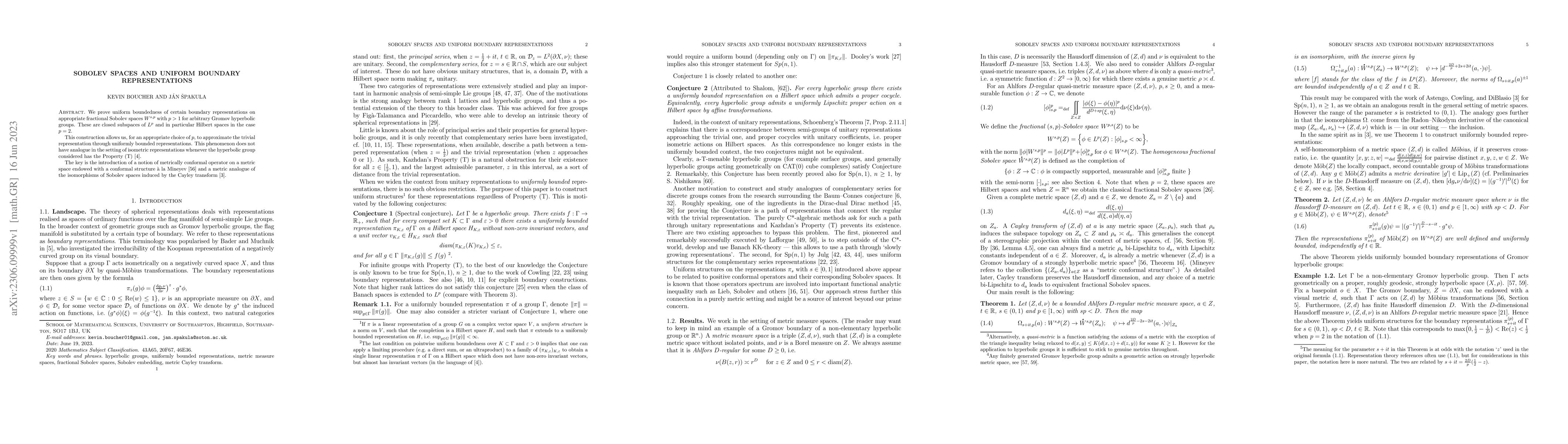 We prove uniform boundedness of certain boundary representations on appropriate fractional Sobolev spaces $W^{s,p}$ with $p>1$ for arbitrary Gromov hyperbolic groups. These are closed subspaces of $L^p$ and in particular Hilbert spaces in the case $p=2$. This construction allows us, for an appropriate choice of $p$, to approximate the trivial representation through uniformly bounded representations. This phenomenon does not have analogue in the setting of isometric representations whenever the hyperbolic group considered has the Property (T). The key is the introduction of a notion of metrically conformal operator on a metric space endowed with a conformal structure \`{a} la Mineyev and a metric analogue of the isomorphisms of Sobolev spaces induced by the Cayley transform.