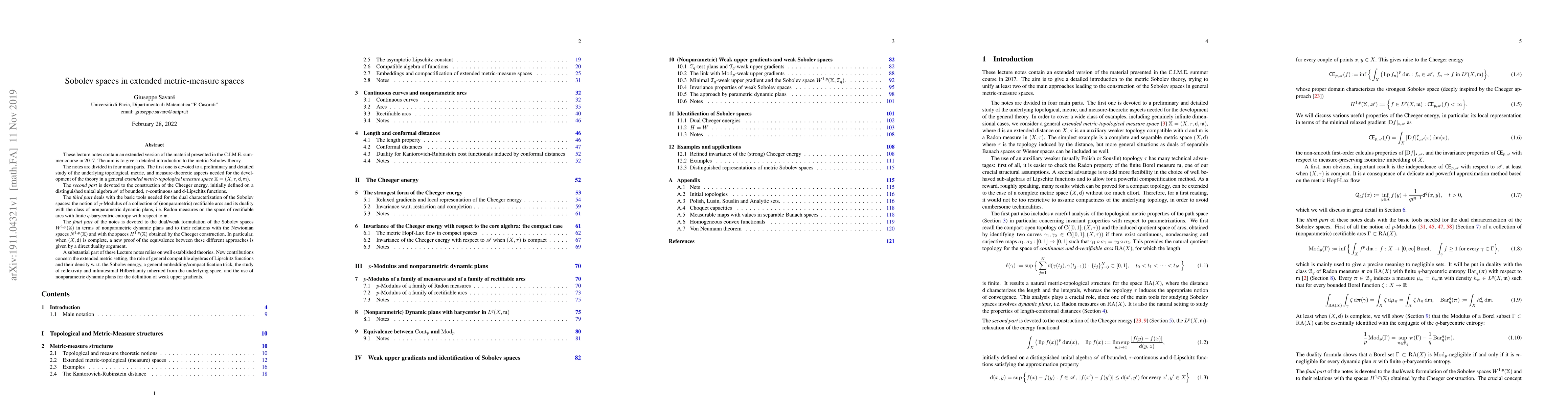 These lecture notes contain an extended version of the material presented in the C.I.M.E. summer course in 2017, aiming to give a detailed introduction to the metric Sobolev theory. The notes are divided in four main parts. The first one is devoted to a preliminary study of the underlying topological, metric, and measure-theoretic aspects of a general extended metric-topological measure space $\mathbb X=(X,\tau,\mathsf d,\mathfrak m)$. The second part is devoted to the construction of the Cheeger energy, initially defined on a distinguished unital algebra of Lipschitz functions. The third part deals with the basic tools needed for the dual characterization of the Sobolev spaces: the notion of $p$-Modulus of a collection of (nonparametric) rectifiable arcs and its duality with the class of nonparametric dynamic plans, i.e.~Radon measures on the space of rectifiable arcs with finite $q$-barycentric entropy with respect to $\mathfrak m$. The final part of the notes is devoted to the dual/weak formulation of the Sobolev spaces $W^{1,p}(\mathbb X)$ in terms of nonparametric dynamic plans and to their relations with the Newtonian spaces $N^{1,p}(\mathbb X)$ and with the spaces $H^{1,p}(\mathbb X)$ obtained by the Cheeger construction. In particular, when $(X,\mathsf d)$ is complete, a new proof of the equivalence between these approaches is given by a direct duality argument. A substantial part of these Lecture notes relies on well established theories. New contributions concern the extended metric setting, the role of general compatible algebras of Lipschitz functions and their density w.r.t.~the Sobolev energy, a compactification trick, the study of reflexivity and infinitesimal Hilbertianity inherited from the underlying space, and the use of nonparametric dynamic plans for the definition of weak upper gradients.