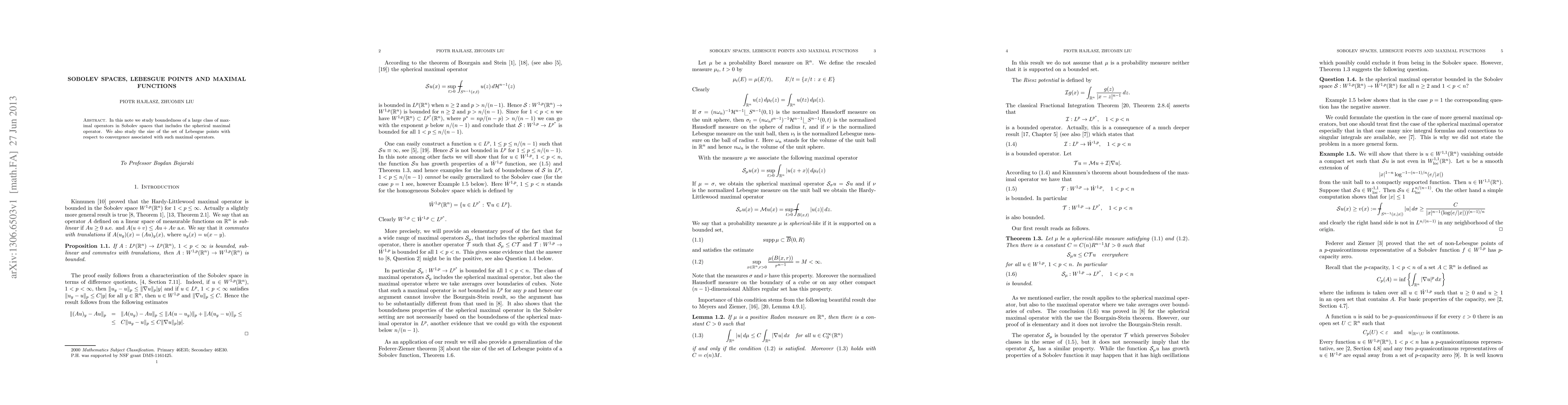 This paper investigates the boundedness of a broad class of maximal operators within Sobolev spaces, including the spherical maximal operator, and examines the size of Lebesgue points concerning convergence related to these operators.