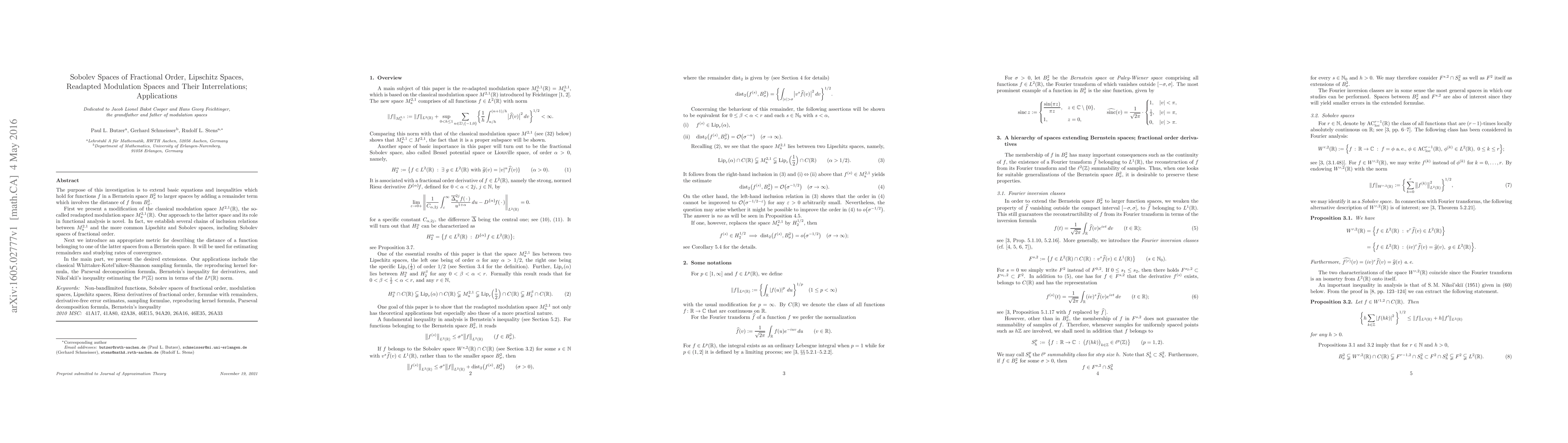 This research extends classical equations and inequalities to larger function spaces by incorporating a remainder term based on distance from a Bernstein space. It introduces a novel readapted modulation space and establishes inclusion relations with Lipschitz and Sobolev spaces, including fractional order Sobolev spaces. Applications cover sampling, reproducing kernel, and decomposition formulas, along with inequalities for derivatives and norms in $l^p(mathbb Z)$ and $L^p(mathbb R)$.