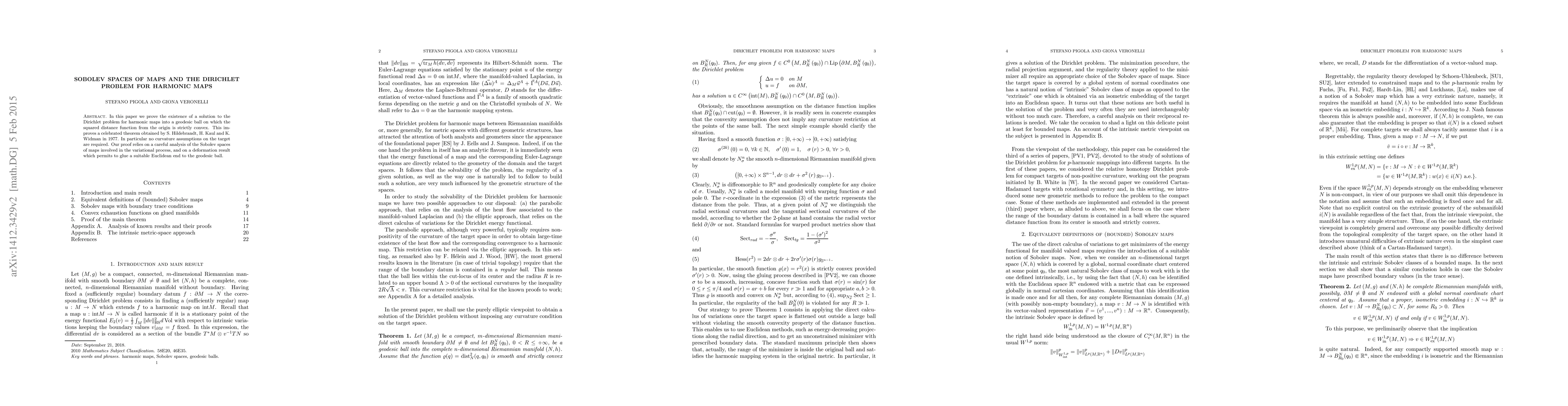 The paper proves the existence of a solution to the Dirichlet problem for harmonic maps into a geodesic ball without requiring curvature assumptions on the target. This improves an existing theorem and relies on analysis of Sobolev spaces and a deformation result to glue a suitable Euclidean end to the geodesic ball.
