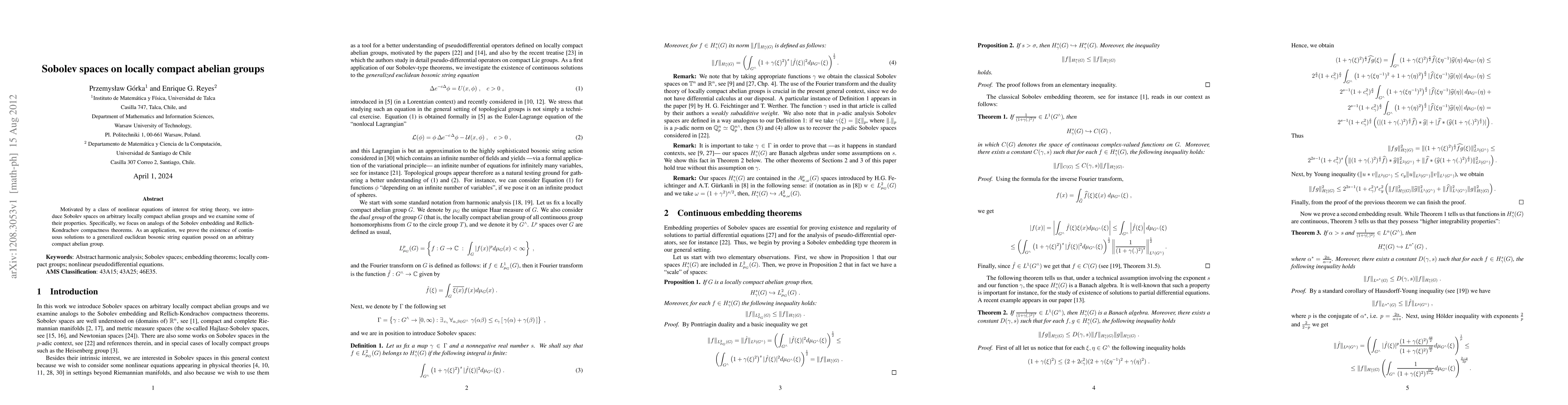 Motivated by a class of nonlinear equations of interest for string theory, we introduce Sobolev spaces on arbitrary locally compact abelian groups and we examine some of their properties. Specifically, we focus on analogs of the Sobolev embedding and Rellich- Kondrachov compactness theorems. As an application, we prove the existence of continuous solutions to a generalized euclidean bosonic string equation possed on an arbitrary compact abelian group.