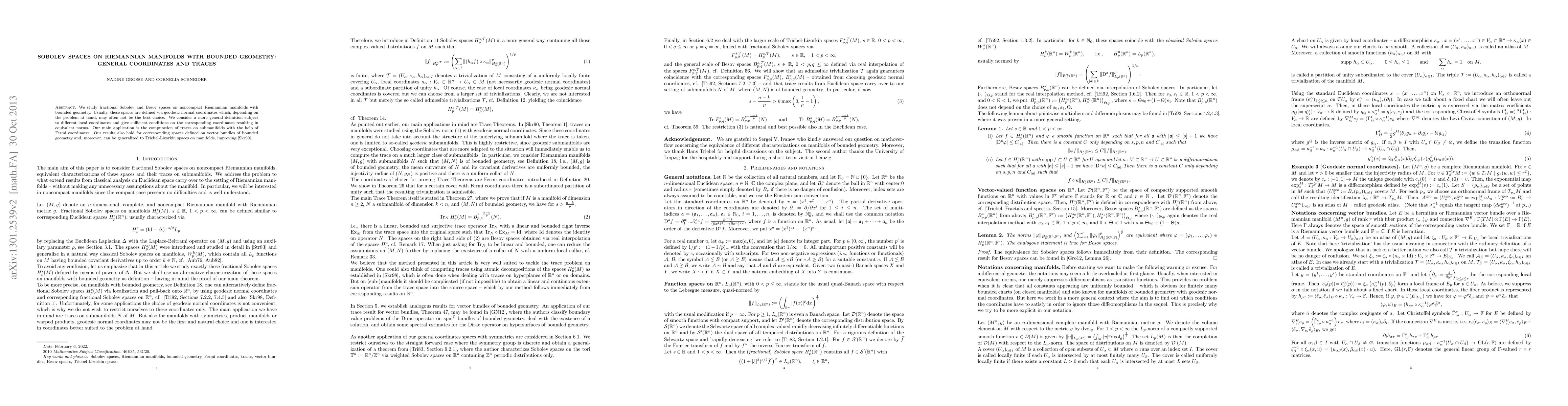 This paper explores the definition of fractional Sobolev and Besov spaces on noncompact Riemannian manifolds using general coordinates instead of geodesic normal coordinates, providing equivalent norms under certain conditions. The study also computes traces on submanifolds using Fermi coordinates, extending results to Triebel-Lizorkin spaces and vector bundles of bounded geometry.