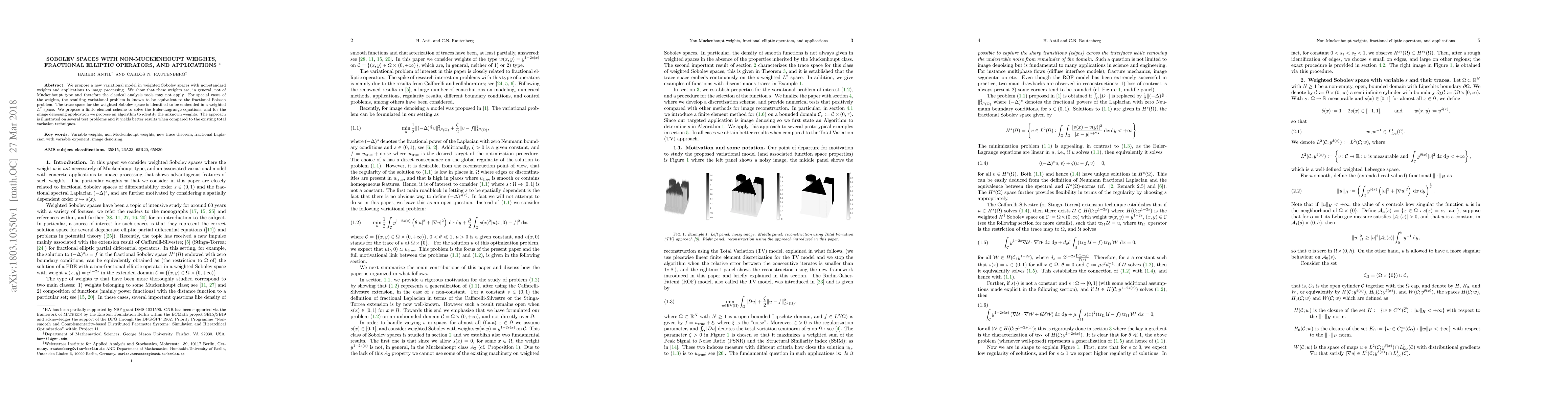 We propose a new variational model in weighted Sobolev spaces with non-standard weights and applications to image processing. We show that these weights are, in general, not of Muckenhoupt type and therefore the classical analysis tools may not apply. For special cases of the weights, the resulting variational problem is known to be equivalent to the fractional Poisson problem. The trace space for the weighted Sobolev space is identified to be embedded in a weighted $L^2$ space. We propose a finite element scheme to solve the Euler-Lagrange equations, and for the image denoising application we propose an algorithm to identify the unknown weights. The approach is illustrated on several test problems and it yields better results when compared to the existing total variation techniques.