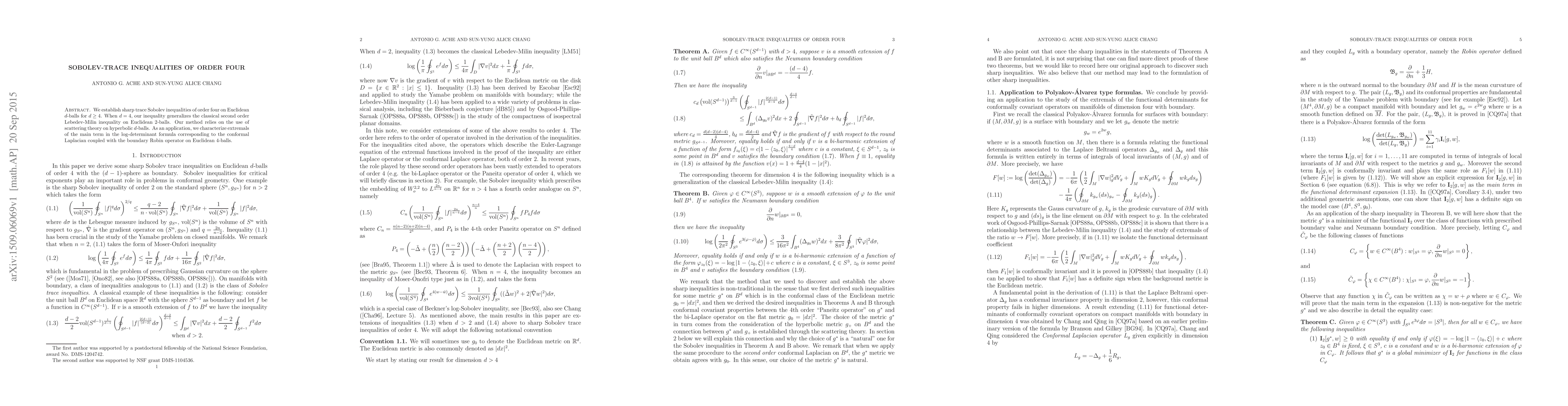 This paper establishes sharp Sobolev inequalities of order four on Euclidean d-balls for d ≥ 4, generalizing the Lebedev-Milin inequality for d=4, and uses scattering theory on hyperbolic d-balls. It also characterizes extremals in the log-determinant formula for the conformal Laplacian with boundary Robin operator on Euclidean 4-balls.