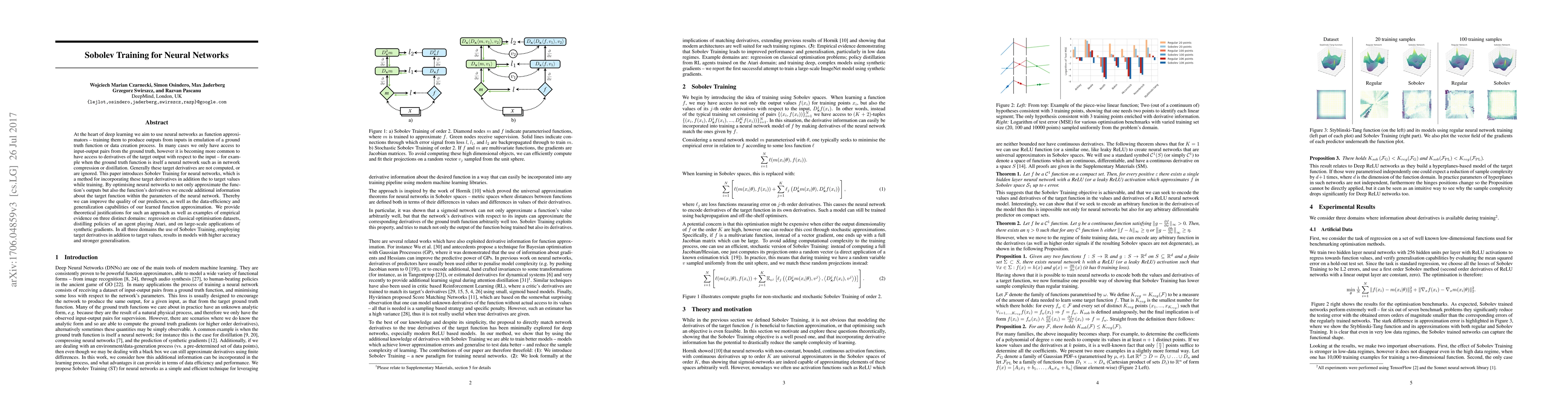 The paper introduces Sobolev Training for neural networks, a method that incorporates target derivatives along with target values during training to improve function approximation quality, data-efficiency, and generalization.