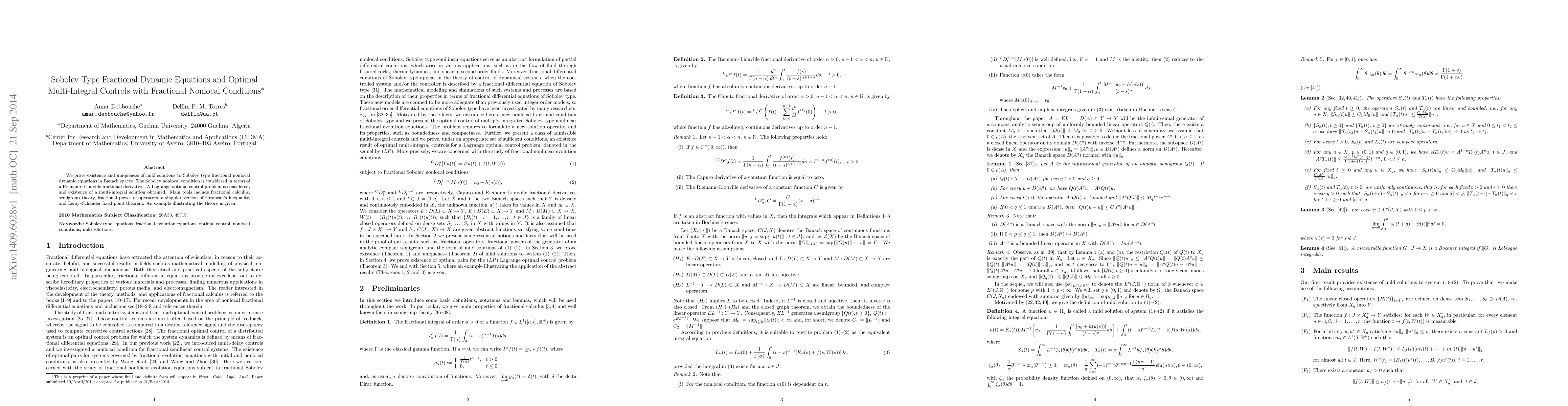 We prove existence and uniqueness of mild solutions to Sobolev type fractional nonlocal dynamic equations in Banach spaces. The Sobolev nonlocal condition is considered in terms of a Riemann-Liouville fractional derivative. A Lagrange optimal control problem is considered, and existence of a multi-integral solution obtained. Main tools include fractional calculus, semigroup theory, fractional power of operators, a singular version of Gronwall's inequality, and Leray-Schauder fixed point theorem. An example illustrating the theory is given.