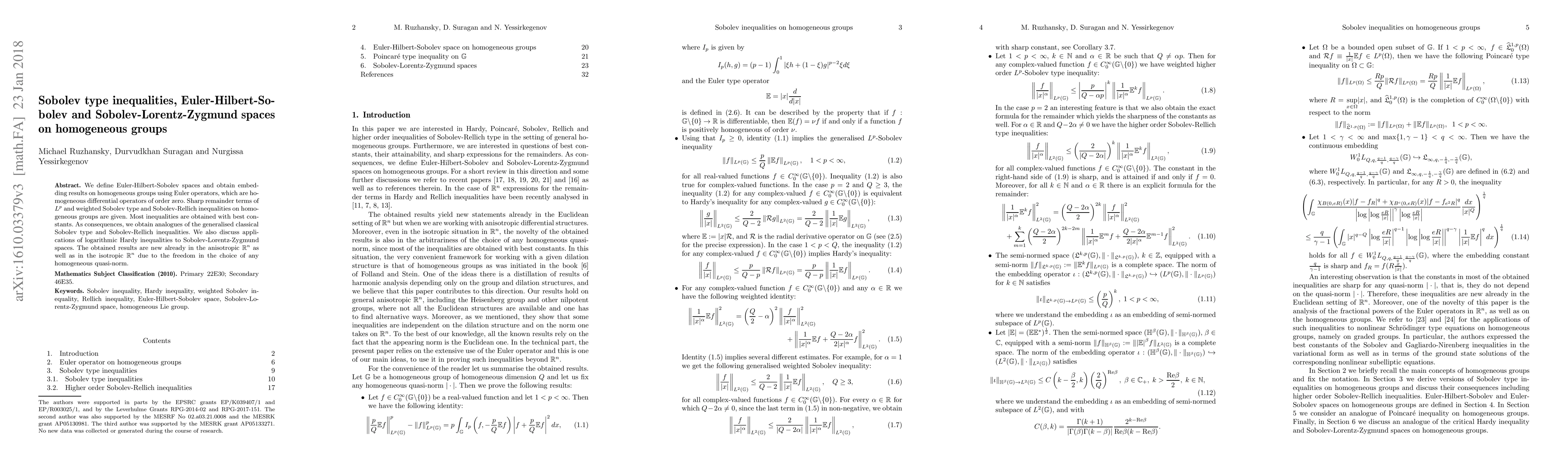 This paper introduces Euler-Hilbert-Sobolev spaces on homogeneous groups and establishes Sobolev-type inequalities, including sharp $L^{p}$ and weighted Sobolev-Rellich inequalities, with optimal constants. It also extends these results to Sobolev-Lorentz-Zygmund spaces and discusses applications of logarithmic Hardy inequalities. The results are novel even in traditional settings like $\mathbb R^{n}$ due to the flexibility of homogeneous quasi-norms.