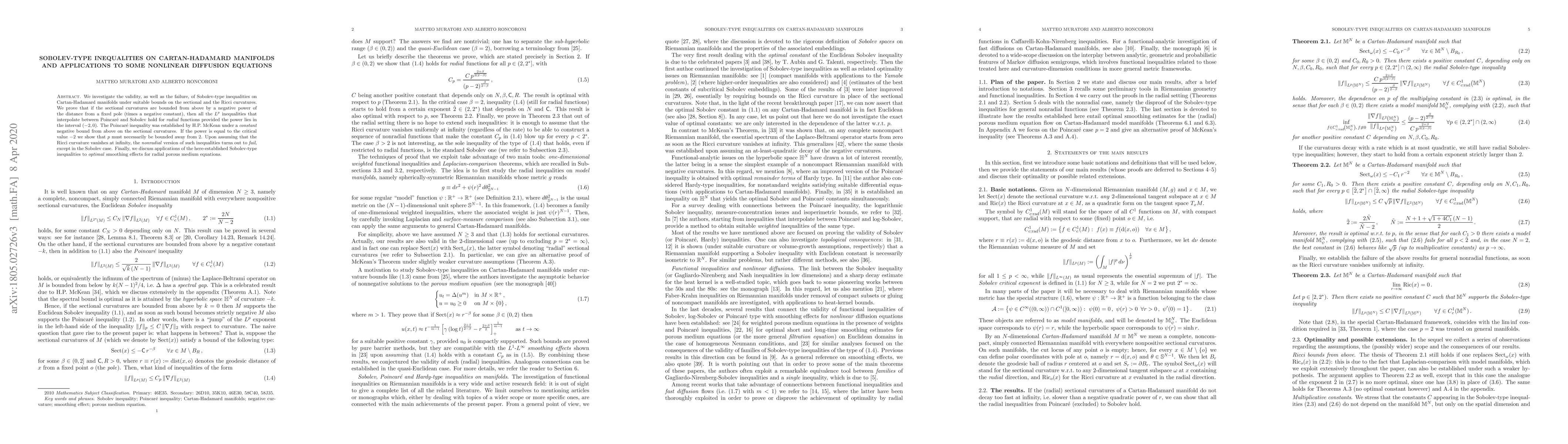Researchers prove that certain Sobolev-type inequalities hold on Cartan-Hadamard manifolds under specific curvature bounds, with implications for smoothing effects in nonlinear diffusion equations.