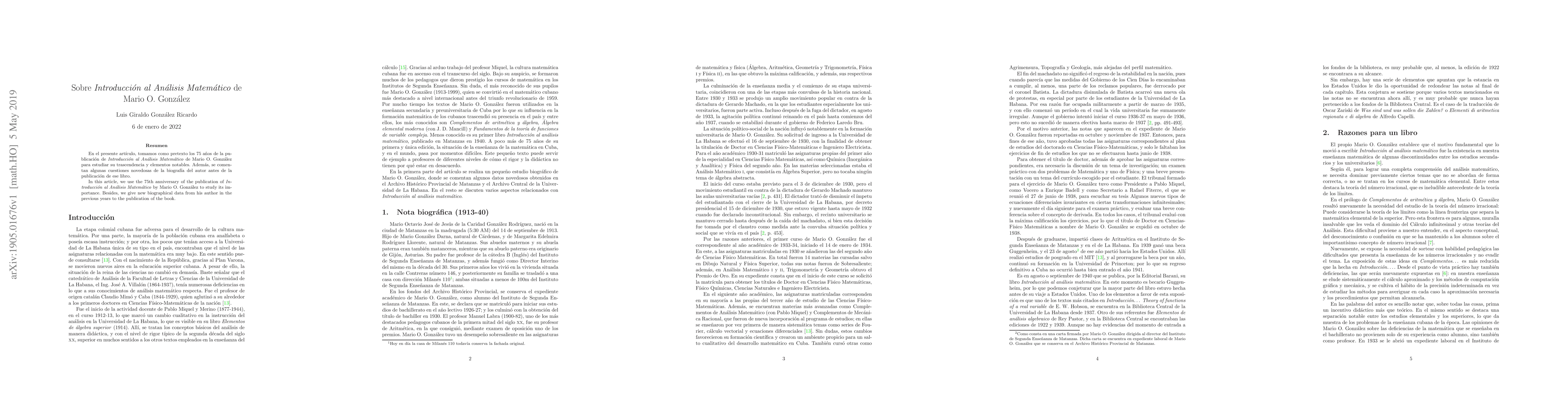 In this article, we use the 75th anniversary of the publication of \emph{Introducci\'on al An\'alisis Matem\'atico} by Mario O. Gonz\'alez to study its importance. Besides, we give new biographical data from his author in the previous years to the publication of the book.