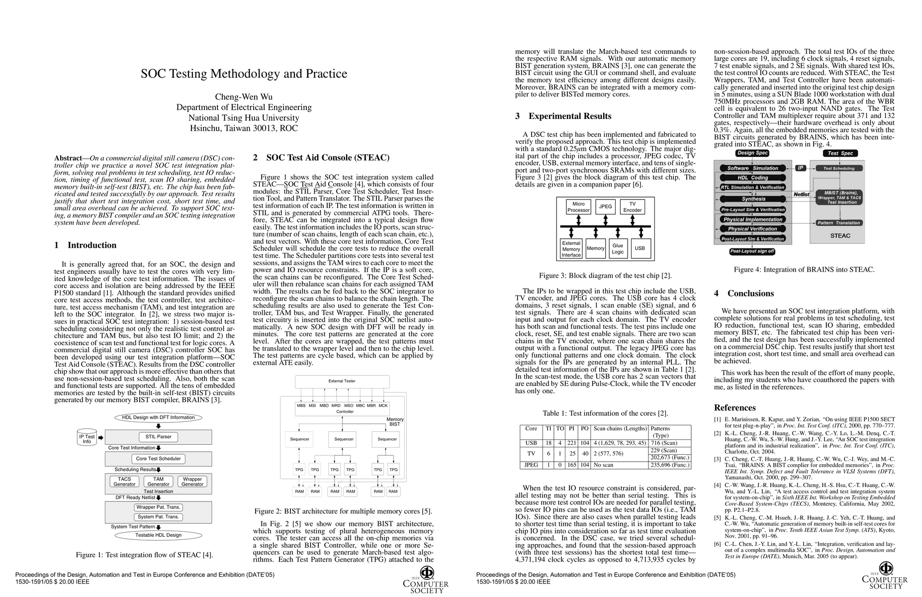 A novel SOC test integration platform has been developed, successfully integrating test scheduling and functional testing into a commercial digital still camera chip. The approach achieves low test integration cost, time, and area overhead, supporting the development of memory BIST compilers and an SOC testing integration system.