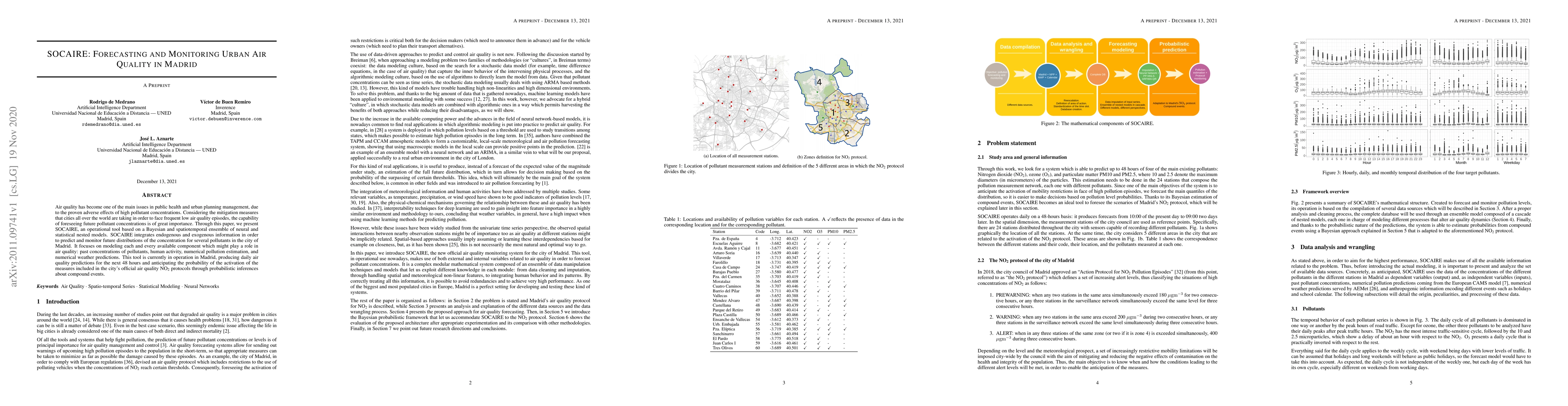 SOCAIRE is an operational tool that uses a Bayesian and spatiotemporal ensemble of neural and statistical models to forecast and monitor urban air quality in Madrid. It integrates various data sources to predict pollutant concentrations and anticipates the need for air quality measures.