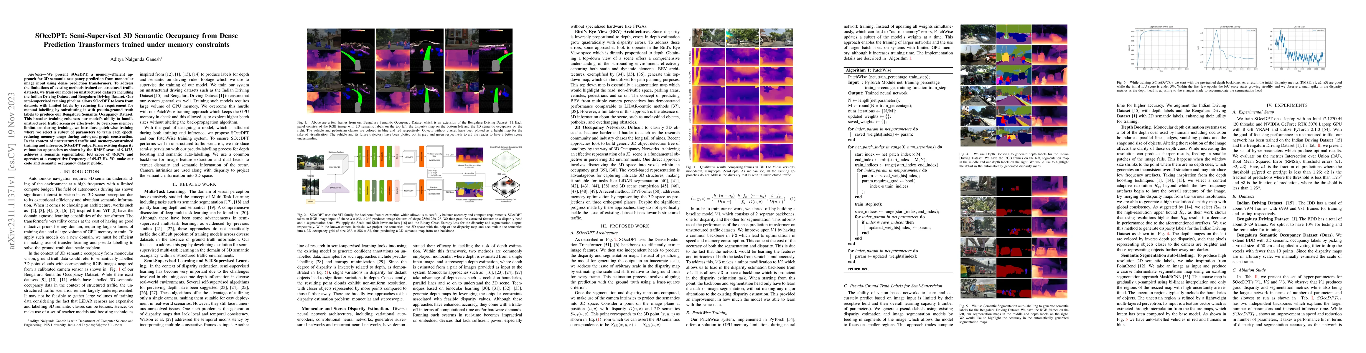 SOccDPT is a memory-efficient semi-supervised 3D semantic occupancy prediction model using dense prediction transformers, trained on unstructured datasets to handle diverse traffic scenarios. It outperforms existing methods under memory constraints, achieving a RMSE of 9.1473 and a 46.02% IoU score.