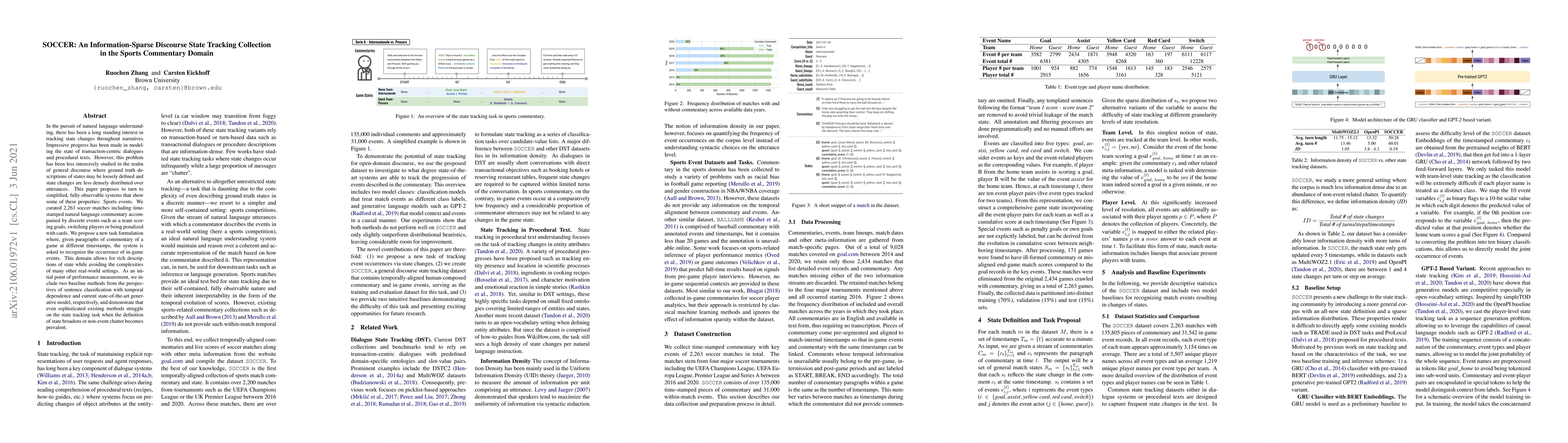 In the pursuit of natural language understanding, there has been a long standing interest in tracking state changes throughout narratives. Impressive progress has been made in modeling the state of transaction-centric dialogues and procedural texts. However, this problem has been less intensively studied in the realm of general discourse where ground truth descriptions of states may be loosely defined and state changes are less densely distributed over utterances. This paper proposes to turn to simplified, fully observable systems that show some of these properties: Sports events. We curated 2,263 soccer matches including time-stamped natural language commentary accompanied by discrete events such as a team scoring goals, switching players or being penalized with cards. We propose a new task formulation where, given paragraphs of commentary of a game at different timestamps, the system is asked to recognize the occurrence of in-game events. This domain allows for rich descriptions of state while avoiding the complexities of many other real-world settings. As an initial point of performance measurement, we include two baseline methods from the perspectives of sentence classification with temporal dependence and current state-of-the-art generative model, respectively, and demonstrate that even sophisticated existing methods struggle on the state tracking task when the definition of state broadens or non-event chatter becomes prevalent.