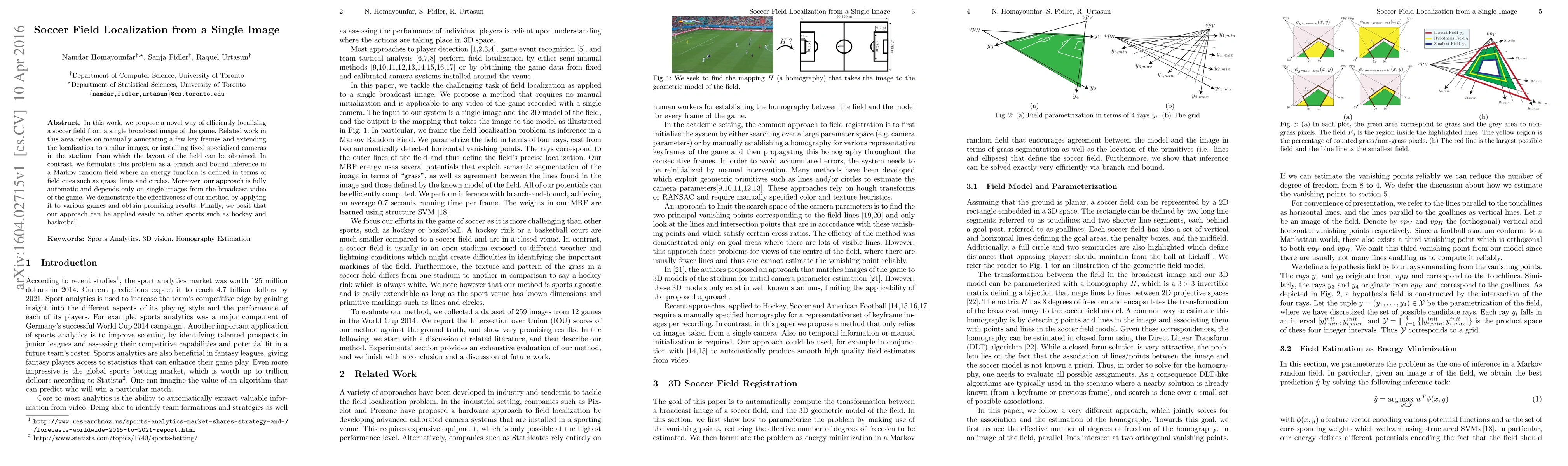 In this work, we propose a novel way of efficiently localizing a soccer field from a single broadcast image of the game. Related work in this area relies on manually annotating a few key frames and extending the localization to similar images, or installing fixed specialized cameras in the stadium from which the layout of the field can be obtained. In contrast, we formulate this problem as a branch and bound inference in a Markov random field where an energy function is defined in terms of field cues such as grass, lines and circles. Moreover, our approach is fully automatic and depends only on single images from the broadcast video of the game. We demonstrate the effectiveness of our method by applying it to various games and obtain promising results. Finally, we posit that our approach can be applied easily to other sports such as hockey and basketball.