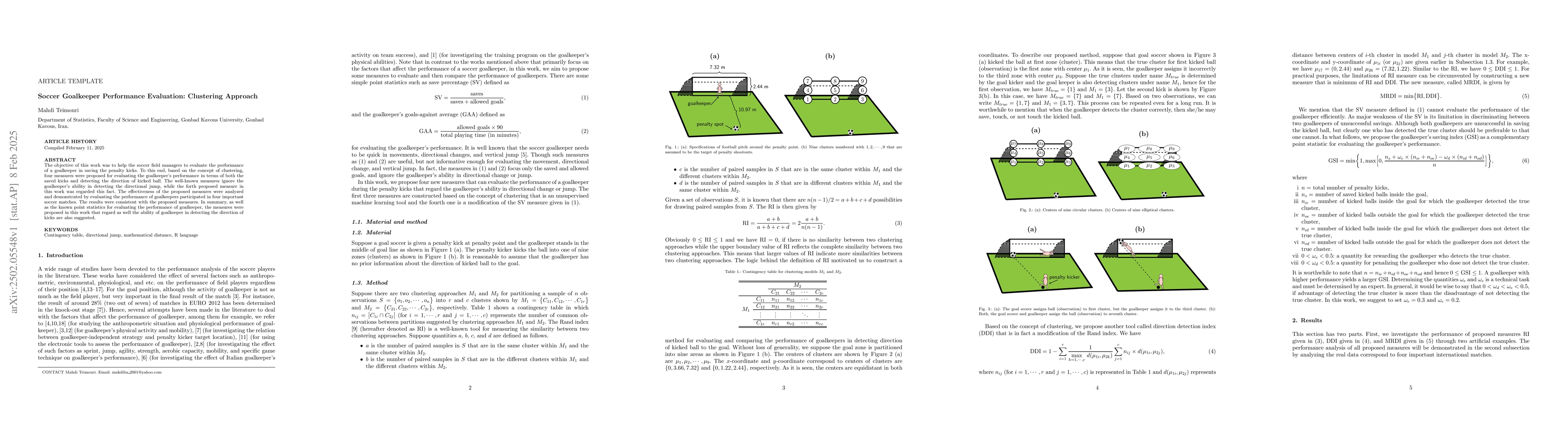 This paper proposes four clustering-based measures to evaluate soccer goalkeepers' performance in saving penalty kicks, emphasizing the importance of detecting the direction of kicked balls. The effectiveness of these measures was demonstrated through the analysis of goalkeepers' performance in four significant soccer matches, showing consistent results.