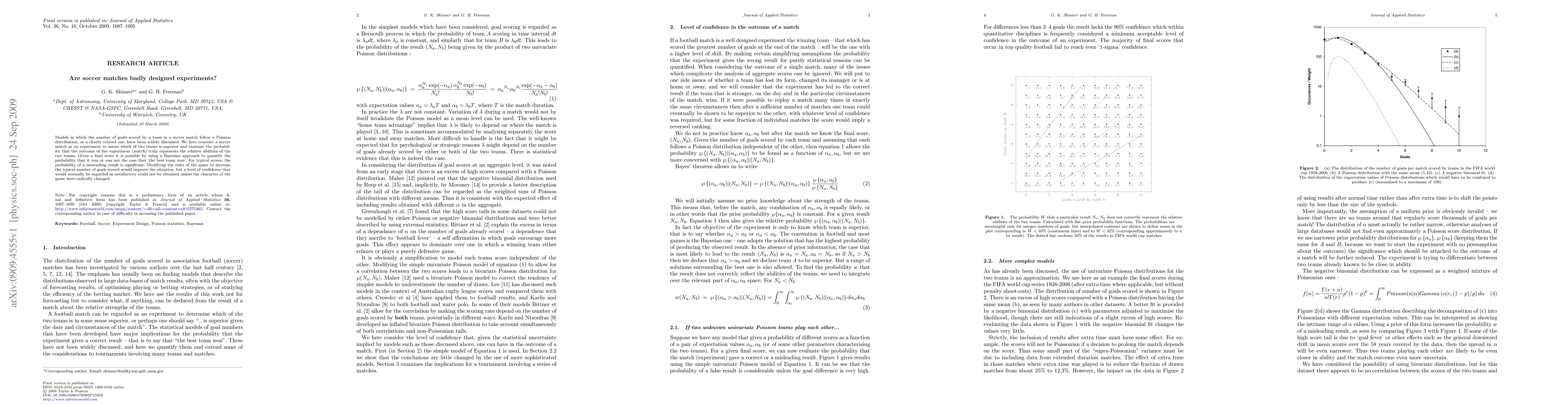 This paper examines soccer matches as experiments to determine team superiority, using Bayesian methods to assess the probability that the winning team truly represents the better team. It finds that for typical match scores, the likelihood of a misleading result is significant, and while increasing goals could improve accuracy, substantial rule changes would be required for satisfactory confidence levels.