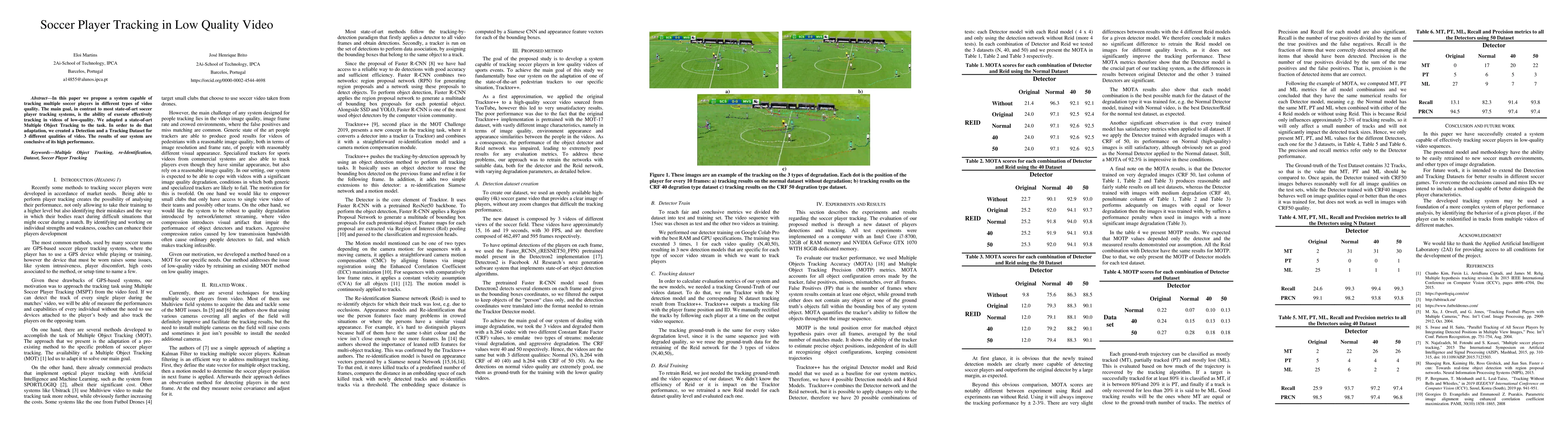 This paper presents a system for tracking soccer players in low-quality videos, adapting state-of-the-art Multiple Object Tracking methods. The authors created specialized datasets for different video qualities, demonstrating high performance in tracking despite low video quality.