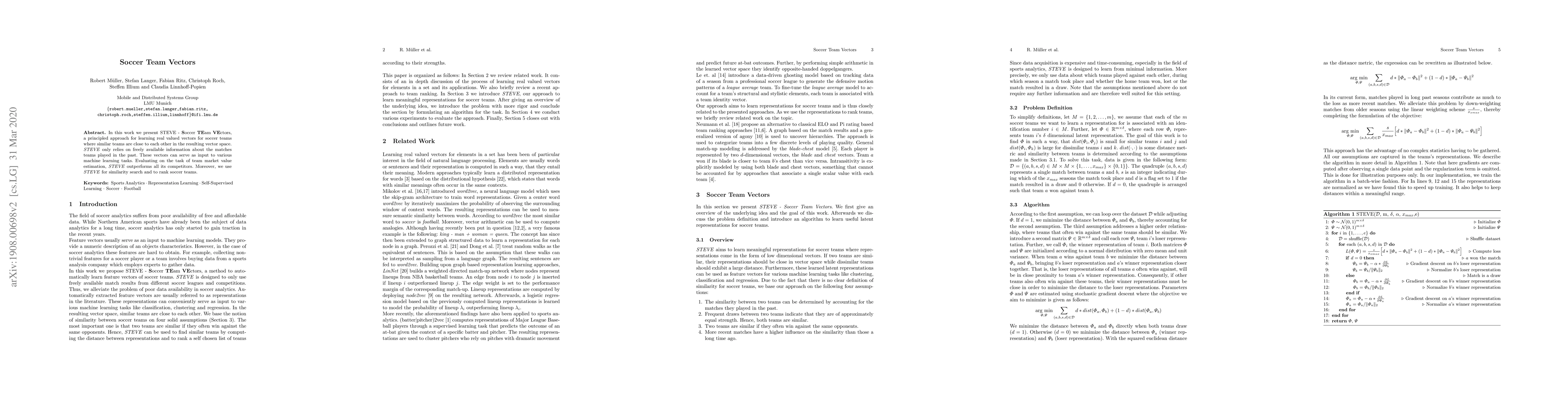 Title: Soccer Team Vectors Abstract: STEVE is a method for learning real-valued vectors representing soccer teams based on past match data, which outperforms competitors in team market value estimation and is useful for similarity search and ranking.