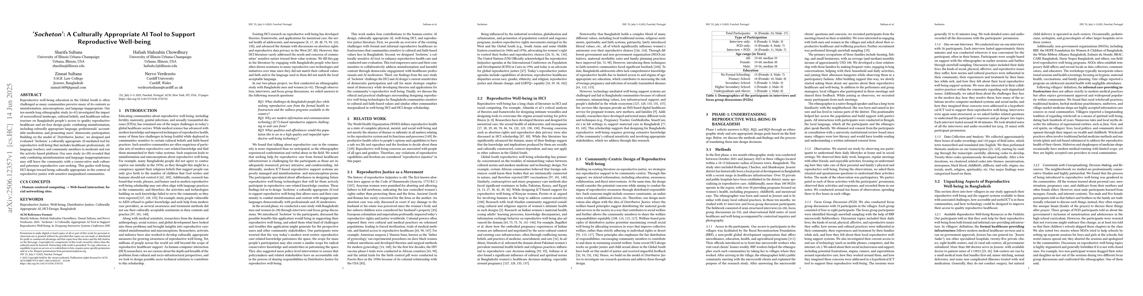 Reproductive well-being education in the Global South is often challenged as many communities perceive many of its contents as misinformation, misconceptions, and language-inappropriate. Our ten-month-long ethnographic study (n=41) investigated the impact of sociocultural landscape, cultural beliefs, and healthcare infrastructure on Bangladeshi people's access to quality reproductive healthcare and set four design goals: combating misinformation, including culturally appropriate language, professionals' accountable moderation, and promoting users' democratic participation. Building on the model of `\textit{Distributive Justice,}' we designed and evaluated \textit{`Socheton,'} a culturally appropriate AI-mediated tool for reproductive well-being that includes healthcare professionals, AI-language teachers, and community members to moderate and run the activity-based platform. Our user study (n=28) revealed that only combating misinformation and language inappropriateness may still leave the community with a conservative mob culture and patronize reproductive care-seeking. This guides well-being HCI design toward being culturally appropriate in the context of reproductive justice with sensitive marginalized communities.