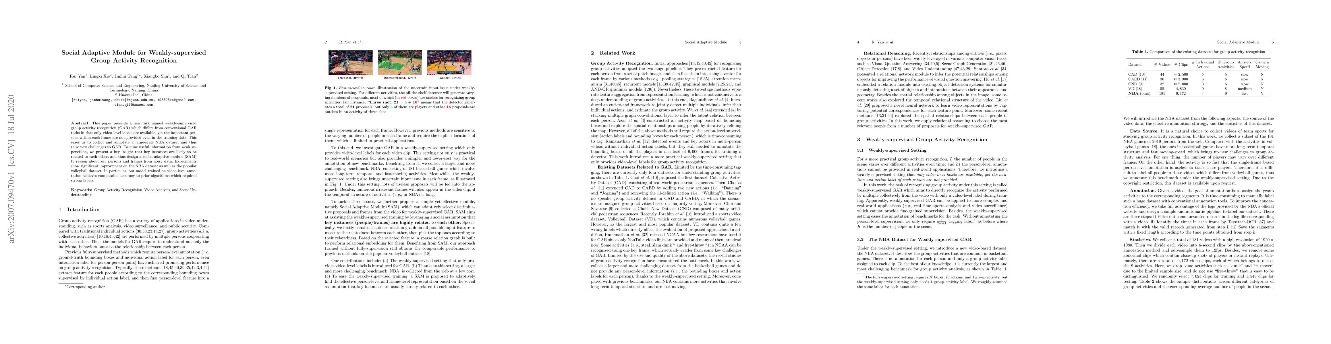This paper introduces a weakly-supervised group activity recognition (GAR) method using a social adaptive module (SAM) to identify key persons and frames from video-level labels only. The approach demonstrates significant improvement on NBA and volleyball datasets, achieving comparable accuracy to methods that use strong labels.