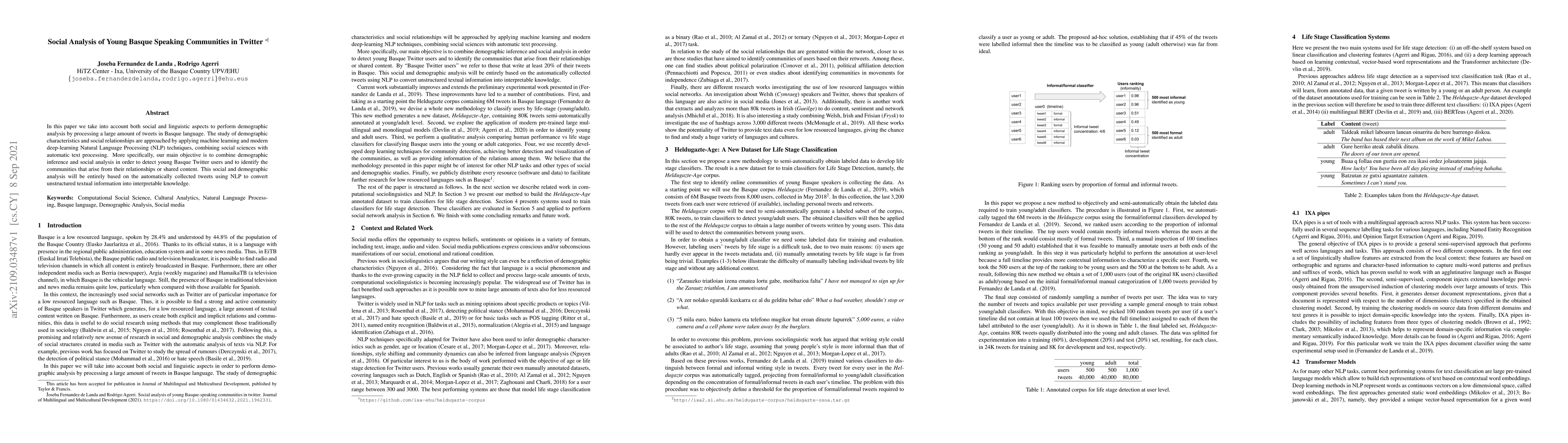 This paper combines social sciences and NLP techniques to analyze demographic characteristics and social relationships among young Basque-speaking Twitter users. It aims to detect these users and identify communities through machine learning and deep-learning methods applied to a large dataset of Basque tweets.