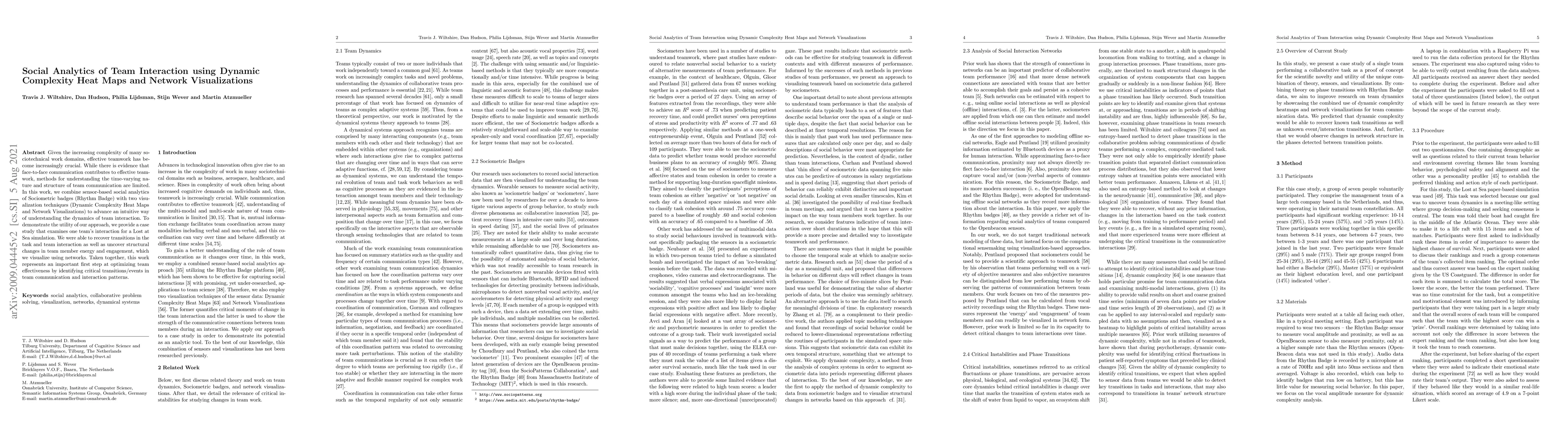 This paper combines sensor-based social analytics with Dynamic Complexity Heat Maps and Network Visualizations to understand team interaction dynamics. The study reveals transitions in task and team communication, and structural changes in team member engagement, demonstrating a method to optimize team effectiveness.