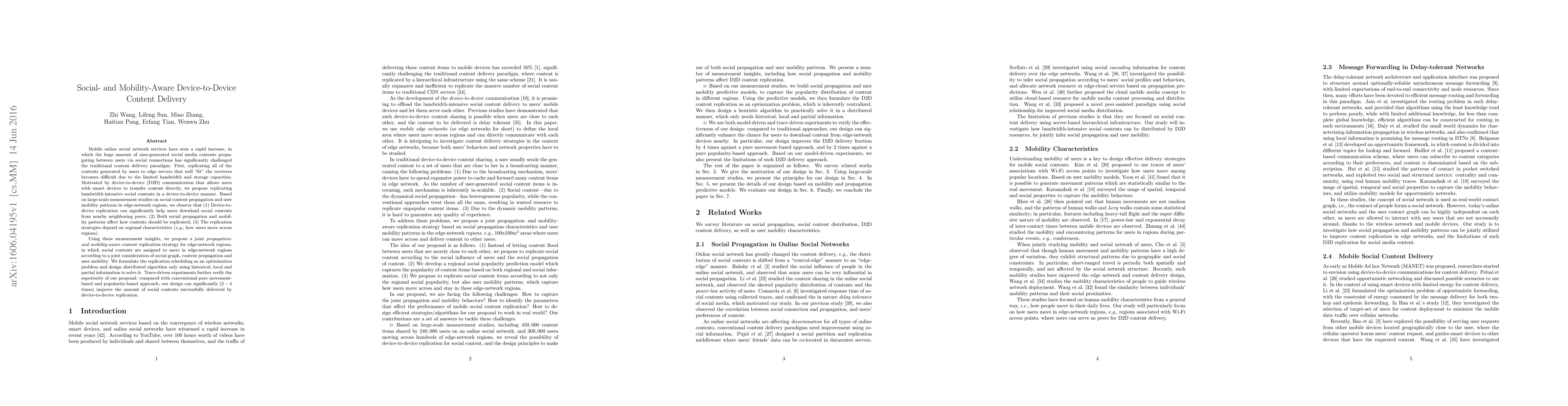 This paper proposes a device-to-device (D2D) content delivery strategy that leverages social connections and user mobility patterns to efficiently replicate social media contents in edge-network regions. The authors develop a propagation- and mobility-aware replication strategy, optimizing content distribution based on local, historical data, and achieving 2-4 times better delivery success compared to traditional methods.
