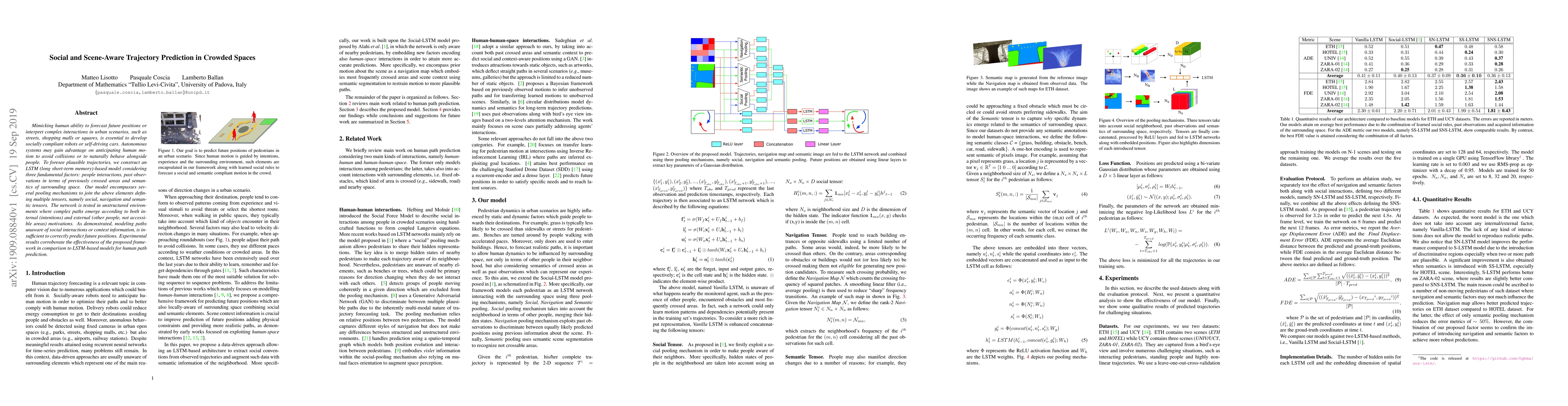 Mimicking human ability to forecast future positions or interpret complex interactions in urban scenarios, such as streets, shopping malls or squares, is essential to develop socially compliant robots or self-driving cars. Autonomous systems may gain advantage on anticipating human motion to avoid collisions or to naturally behave alongside people. To foresee plausible trajectories, we construct an LSTM (long short-term memory)-based model considering three fundamental factors: people interactions, past observations in terms of previously crossed areas and semantics of surrounding space. Our model encompasses several pooling mechanisms to join the above elements defining multiple tensors, namely social, navigation and semantic tensors. The network is tested in unstructured environments where complex paths emerge according to both internal (intentions) and external (other people, not accessible areas) motivations. As demonstrated, modeling paths unaware of social interactions or context information, is insufficient to correctly predict future positions. Experimental results corroborate the effectiveness of the proposed framework in comparison to LSTM-based models for human path prediction.