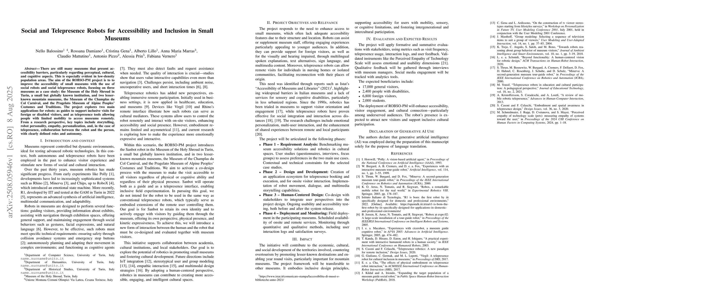 There are still many museums that present accessibility barriers, particularly regarding perceptual, cultural, and cognitive aspects. This is especially evident in low-density population areas. The aim of the ROBSO-PM project is to improve the accessibility of small museums through the use of social robots and social telepresence robots, focusing on three museums as case studies: the Museum of the Holy Shroud in Turin, a small but globally known institution, and two lesser known mountain museums: the Museum of the Champlas du Col Carnival and the Pragelato Museum of Alpine Peoples' Costumes and Traditions. The project explores two main applications for robots: as guides supporting inclusive visits for foreign or disabled visitors, and as telepresence tools allowing people with limited mobility to access museums remotely. From a research perspective, key topics include storytelling, robot personality, empathy, personalization, and, in the case of telepresence, collaboration between the robot and the person, with clearly defined roles and autonomy.