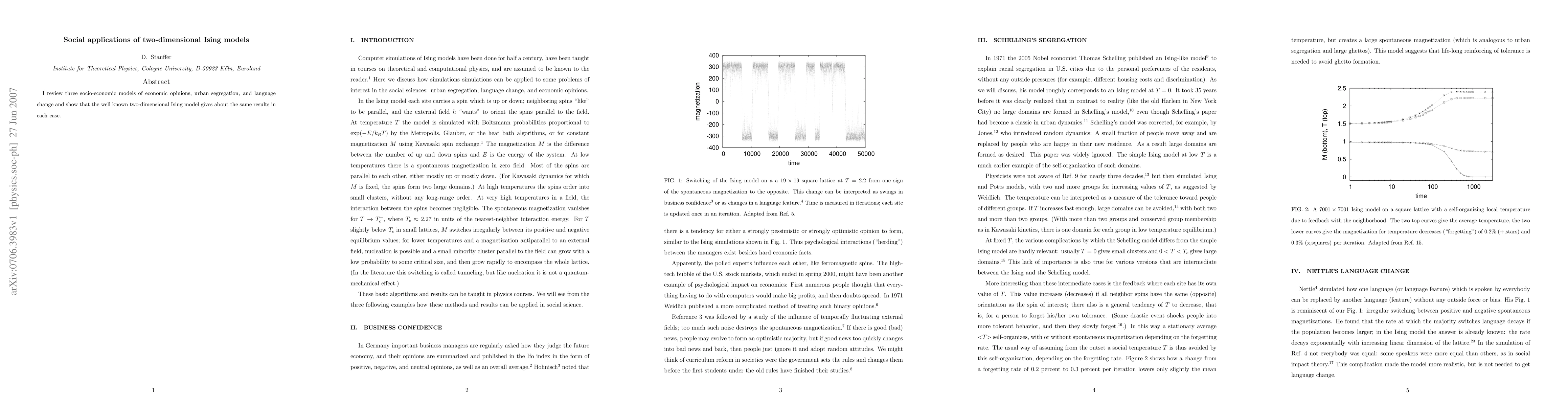 Summary: This paper reviews the application of the two-dimensional Ising model to socio-economic phenomena, demonstrating its effectiveness in modeling economic opinions, urban segregation, and language change. The findings suggest that the Ising model provides comparable results across these diverse social contexts.