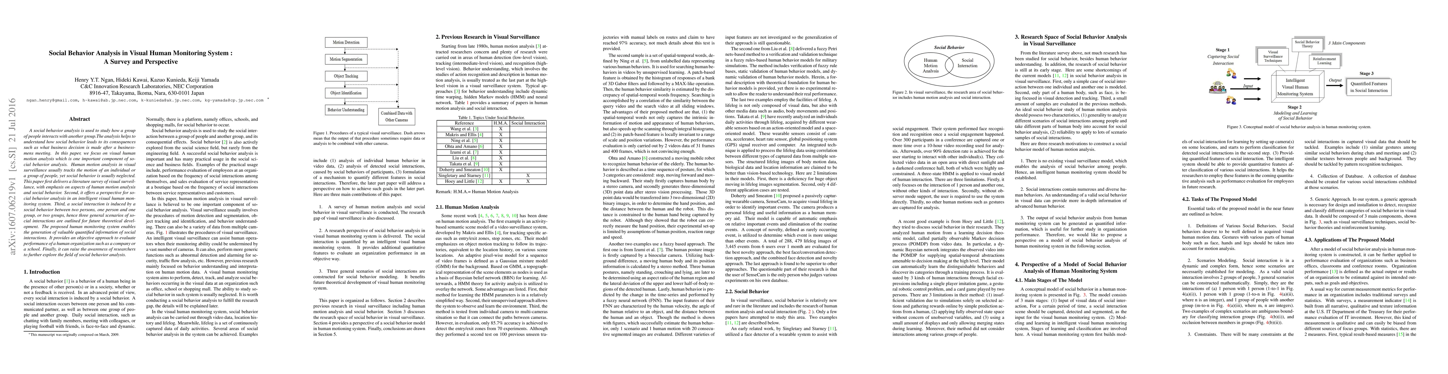 A social behavior analysis is used to study how a group of people interacts with another group. The analysis helps to understand how social behavior leads to its consequences such as what business decision is made after a businessmen's meeting. In this paper, we focus on visual human motion analysis which is one important component of social behavior analysis. Human motion analysis in visual surveillance usually tracks the motion of an individual or a group of people, yet social behavior is usually neglected. This paper first delivers a literature survey of visual surveillance, with emphasis on aspects of human motion analysis and social behavior. Second, it offers a perspective for social behavior analysis in an intelligent visual human monitoring system. Third, a social interaction is induced by a social behavior between two persons, one person and one group, or two groups, hence three general scenarios of social interactions are outlined for future theoretical development. The proposed human monitoring system enables the generation of valuable quantified information of social interactions. It provides an objective approach to evaluate performance of a human organization such as a company or a school. Finally, it can raise the awareness of researchers to further explore the field of social behavior analysis.