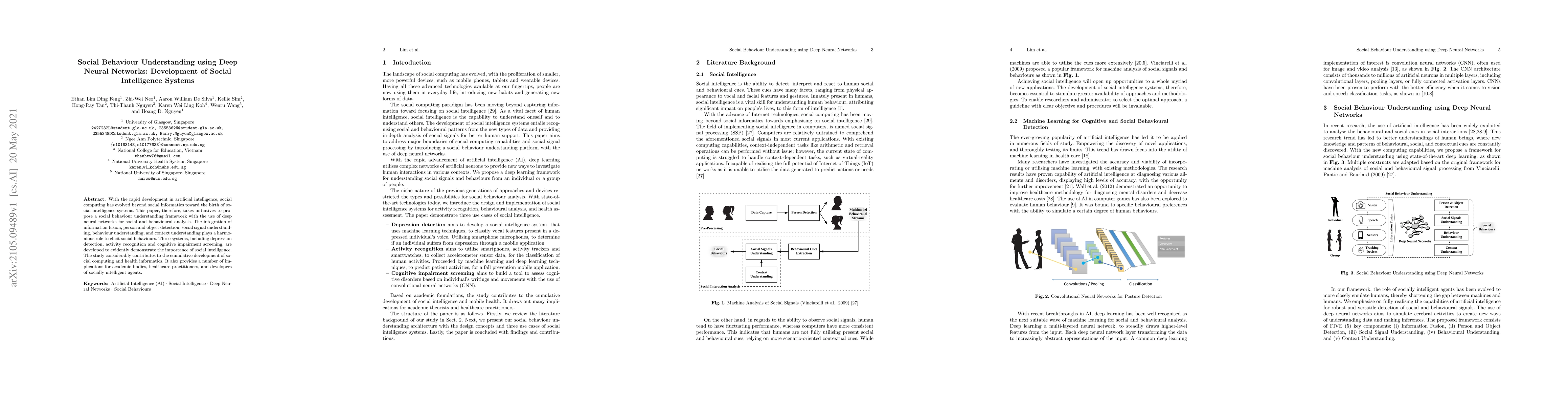 With the rapid development in artificial intelligence, social computing has evolved beyond social informatics toward the birth of social intelligence systems. This paper, therefore, takes initiatives to propose a social behaviour understanding framework with the use of deep neural networks for social and behavioural analysis. The integration of information fusion, person and object detection, social signal understanding, behaviour understanding, and context understanding plays a harmonious role to elicit social behaviours. Three systems, including depression detection, activity recognition and cognitive impairment screening, are developed to evidently demonstrate the importance of social intelligence. The study considerably contributes to the cumulative development of social computing and health informatics. It also provides a number of implications for academic bodies, healthcare practitioners, and developers of socially intelligent agents.