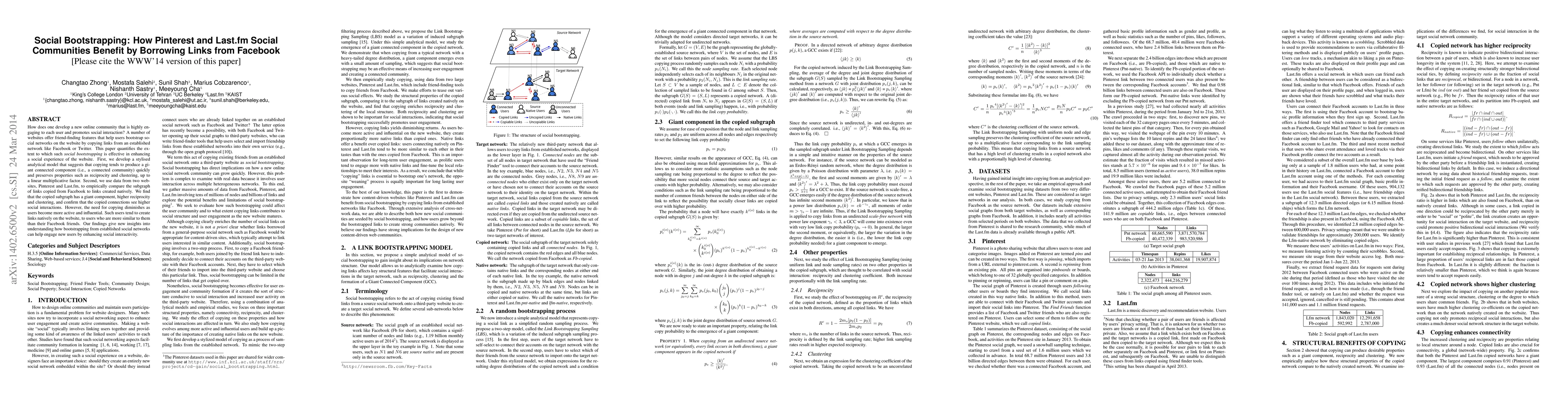 How does one develop a new online community that is highly engaging to each user and promotes social interaction? A number of websites offer friend-finding features that help users bootstrap social networks on the website by copying links from an established network like Facebook or Twitter. This paper quantifies the extent to which such social bootstrapping is effective in enhancing a social experience of the website. First, we develop a stylised analytical model that suggests that copying tends to produce a giant connected component (i.e., a connected community) quickly and preserves properties such as reciprocity and clustering, up to a linear multiplicative factor. Second, we use data from two websites, Pinterest and Last.fm, to empirically compare the subgraph of links copied from Facebook to links created natively. We find that the copied subgraph has a giant component, higher reciprocity and clustering, and confirm that the copied connections see higher social interactions. However, the need for copying diminishes as users become more active and influential. Such users tend to create links natively on the website, to users who are more similar to them than their Facebook friends. Our findings give new insights into understanding how bootstrapping from established social networks can help engage new users by enhancing social interactivity.