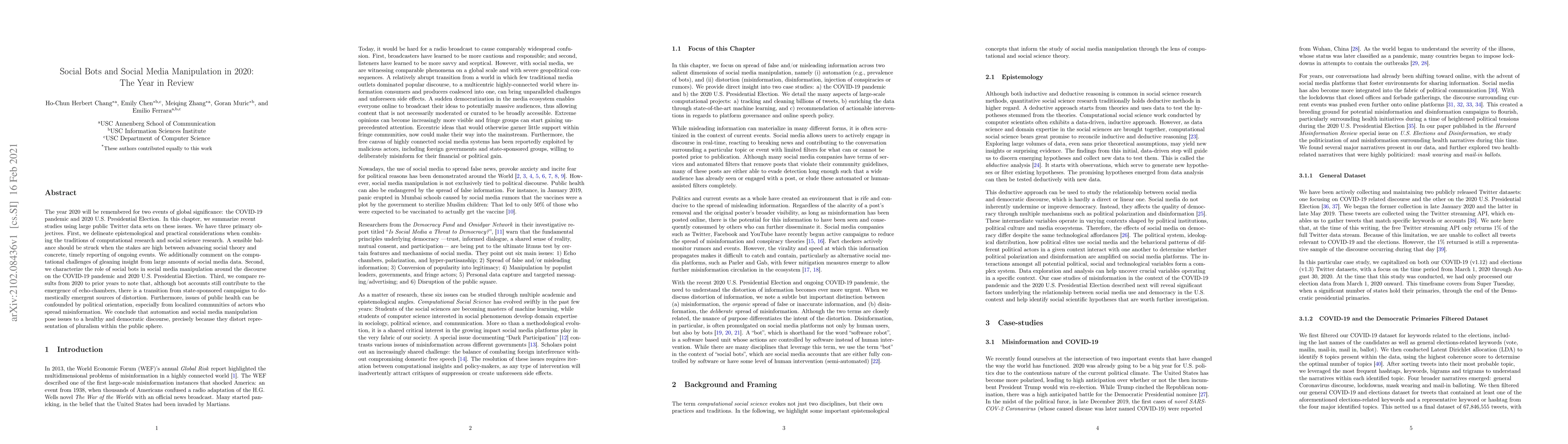 The year 2020 will be remembered for two events of global significance: the COVID-19 pandemic and 2020 U.S. Presidential Election. In this chapter, we summarize recent studies using large public Twitter data sets on these issues. We have three primary objectives. First, we delineate epistemological and practical considerations when combining the traditions of computational research and social science research. A sensible balance should be struck when the stakes are high between advancing social theory and concrete, timely reporting of ongoing events. We additionally comment on the computational challenges of gleaning insight from large amounts of social media data. Second, we characterize the role of social bots in social media manipulation around the discourse on the COVID-19 pandemic and 2020 U.S. Presidential Election. Third, we compare results from 2020 to prior years to note that, although bot accounts still contribute to the emergence of echo-chambers, there is a transition from state-sponsored campaigns to domestically emergent sources of distortion. Furthermore, issues of public health can be confounded by political orientation, especially from localized communities of actors who spread misinformation. We conclude that automation and social media manipulation pose issues to a healthy and democratic discourse, precisely because they distort representation of pluralism within the public sphere.
