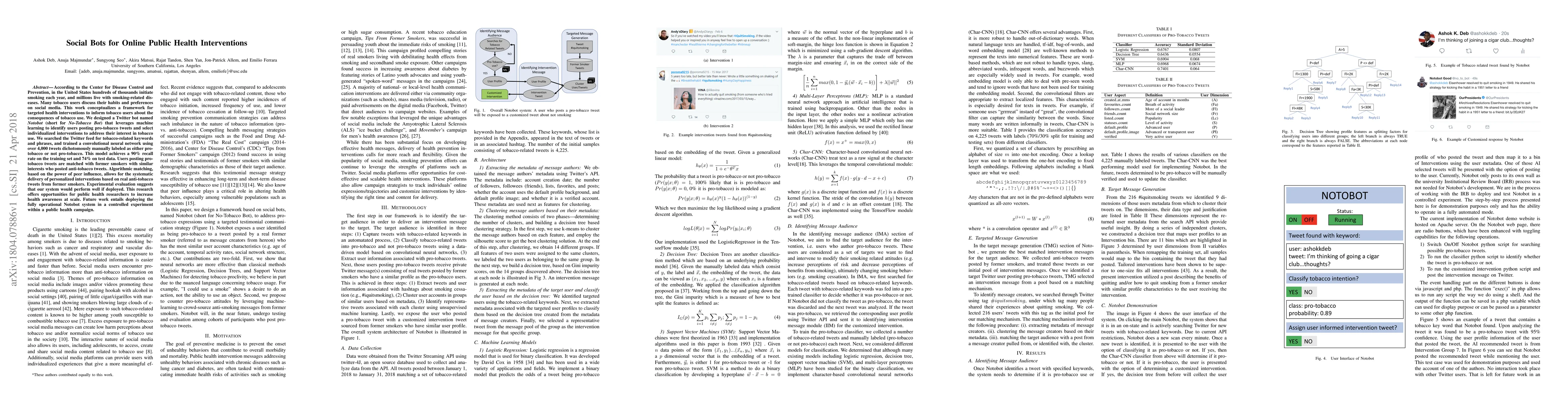 This research develops a Twitter bot named Notobot to target tobacco users on social media with personalized anti-tobacco messages. The bot uses machine learning to identify pro-tobacco tweets and matches them with anti-tobacco tweets from former smokers, leveraging peer influence for effective health interventions.