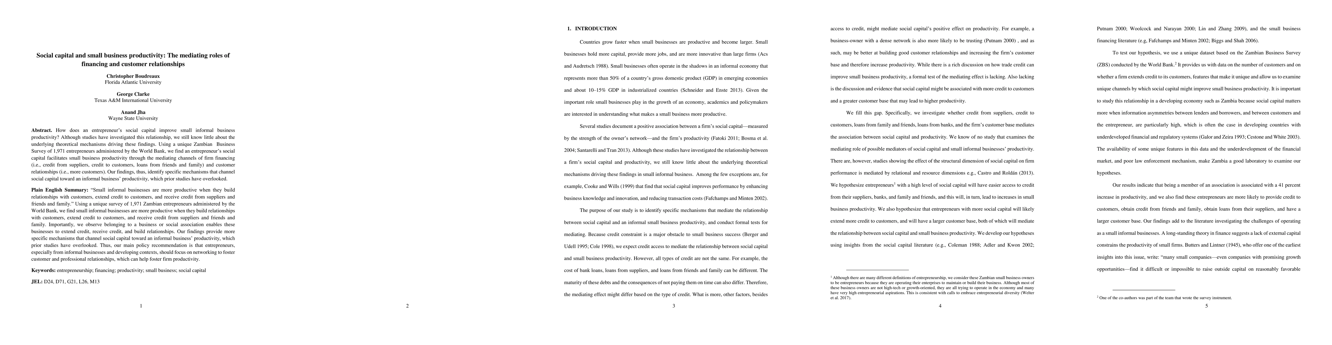 This study examines how social capital enhances small informal business productivity in Zambia, revealing that financing and customer relationships mediate this relationship. The findings highlight overlooked mechanisms that link social capital to business productivity.