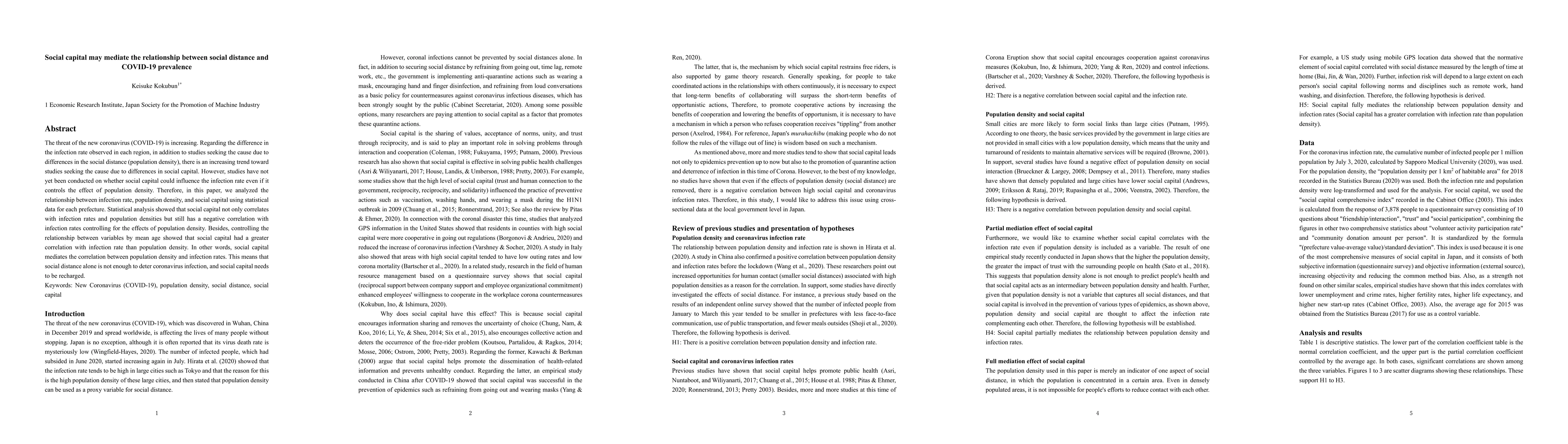 The threat of the new coronavirus (COVID-19) is increasing. Regarding the difference in the infection rate observed in each region, in addition to studies seeking the cause due to differences in the social distance (population density), there is an increasing trend toward studies seeking the cause due to differences in social capital. However, studies have not yet been conducted on whether social capital could influence the infection rate even if it controls the effect of population density. Therefore, in this paper, we analyzed the relationship between infection rate, population density, and social capital using statistical data for each prefecture. Statistical analysis showed that social capital not only correlates with infection rates and population densities but still has a negative correlation with infection rates controlling for the effects of population density. Besides, controlling the relationship between variables by mean age showed that social capital had a greater correlation with infection rate than population density. In other words, social capital mediates the correlation between population density and infection rates. This means that social distance alone is not enough to deter coronavirus infection, and social capital needs to be recharged.