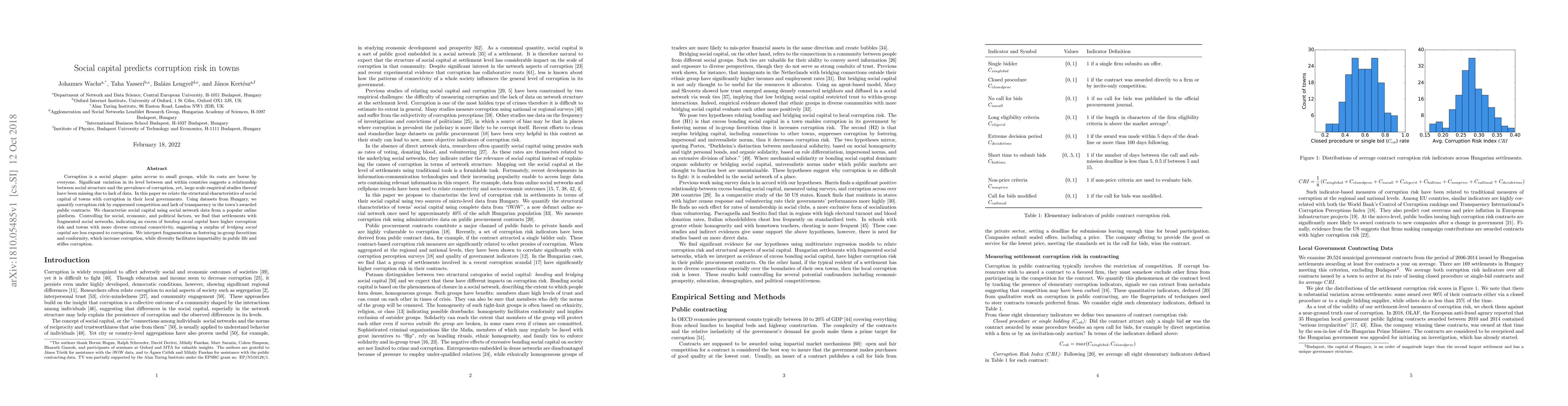 Corruption is a social plague: gains accrue to small groups, while its costs are borne by everyone. Significant variation in its level between and within countries suggests a relationship between social structure and the prevalence of corruption, yet, large scale empirical studies thereof have been missing due to lack of data. In this paper we relate the structural characteristics of social capital of towns with corruption in their local governments. Using datasets from Hungary, we quantify corruption risk by suppressed competition and lack of transparency in the town's awarded public contracts. We characterize social capital using social network data from a popular online platform. Controlling for social, economic, and political factors, we find that settlements with fragmented social networks, indicating an excess of \textit{bonding social capital} have higher corruption risk and towns with more diverse external connectivity, suggesting a surplus of \textit{bridging social capital} are less exposed to corruption. We interpret fragmentation as fostering in-group favoritism and conformity, which increase corruption, while diversity facilitates impartiality in public life and stifles corruption.