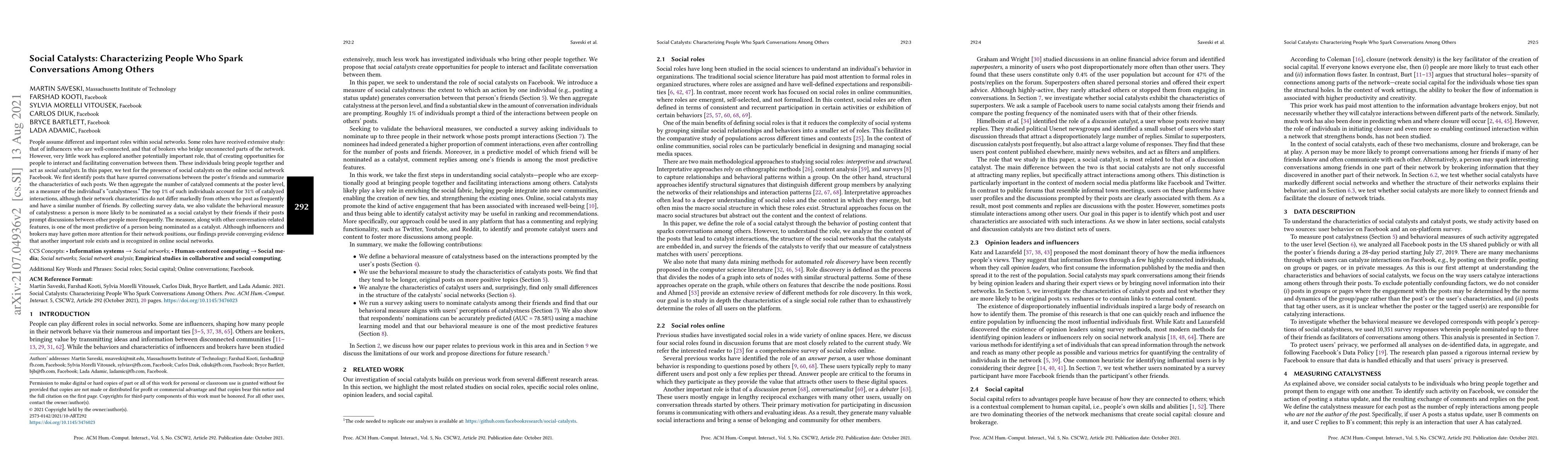 People assume different and important roles within social networks. Some roles have received extensive study: that of influencers who are well-connected, and that of brokers who bridge unconnected parts of the network. However, very little work has explored another potentially important role, that of creating opportunities for people to interact and facilitating conversation between them. These individuals bring people together and act as social catalysts. In this paper, we test for the presence of social catalysts on the online social network Facebook. We first identify posts that have spurred conversations between the poster's friends and summarize the characteristics of such posts. We then aggregate the number of catalyzed comments at the poster level, as a measure of the individual's "catalystness." The top 1% of such individuals account for 31% of catalyzed interactions, although their network characteristics do not differ markedly from others who post as frequently and have a similar number of friends. By collecting survey data, we also validate the behavioral measure of catalystness: a person is more likely to be nominated as a social catalyst by their friends if their posts prompt discussions between other people more frequently. The measure, along with other conversation-related features, is one of the most predictive of a person being nominated as a catalyst. Although influencers and brokers may have gotten more attention for their network positions, our findings provide converging evidence that another important role exists and is recognized in online social networks.