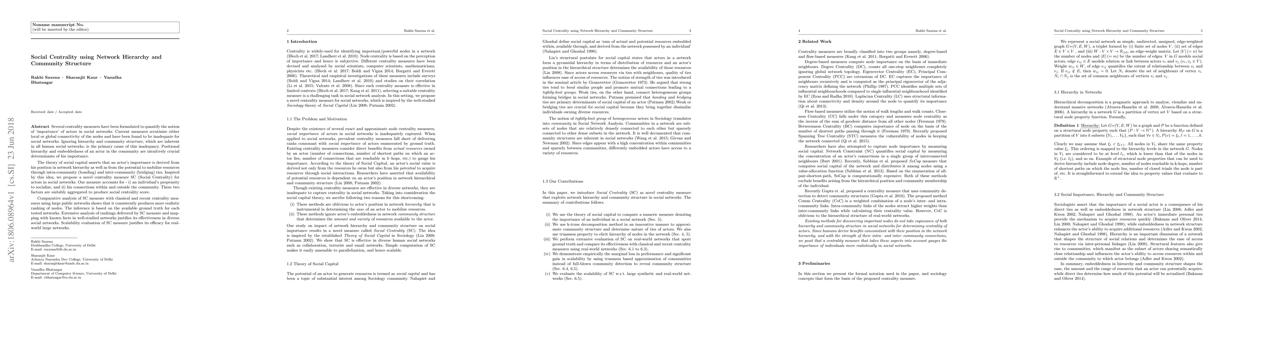 This paper proposes a novel centrality measure, SC (Social Centrality), to better quantify the importance of actors in social networks by considering both network hierarchy and community structure. The proposed method outperforms traditional centrality measures by more accurately reflecting the social capital derived from an actor's position and their ability to mobilize resources through intra- and inter-community ties.