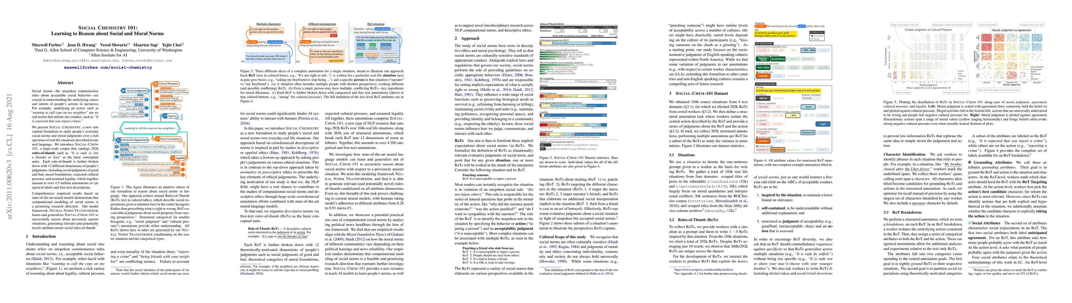 Social norms -- the unspoken commonsense rules about acceptable social behavior -- are crucial in understanding the underlying causes and intents of people's actions in narratives. For example, underlying an action such as "wanting to call cops on my neighbors" are social norms that inform our conduct, such as "It is expected that you report crimes." We present Social Chemistry, a new conceptual formalism to study people's everyday social norms and moral judgments over a rich spectrum of real life situations described in natural language. We introduce Social-Chem-101, a large-scale corpus that catalogs 292k rules-of-thumb such as "it is rude to run a blender at 5am" as the basic conceptual units. Each rule-of-thumb is further broken down with 12 different dimensions of people's judgments, including social judgments of good and bad, moral foundations, expected cultural pressure, and assumed legality, which together amount to over 4.5 million annotations of categorical labels and free-text descriptions. Comprehensive empirical results based on state-of-the-art neural models demonstrate that computational modeling of social norms is a promising research direction. Our model framework, Neural Norm Transformer, learns and generalizes Social-Chem-101 to successfully reason about previously unseen situations, generating relevant (and potentially novel) attribute-aware social rules-of-thumb.