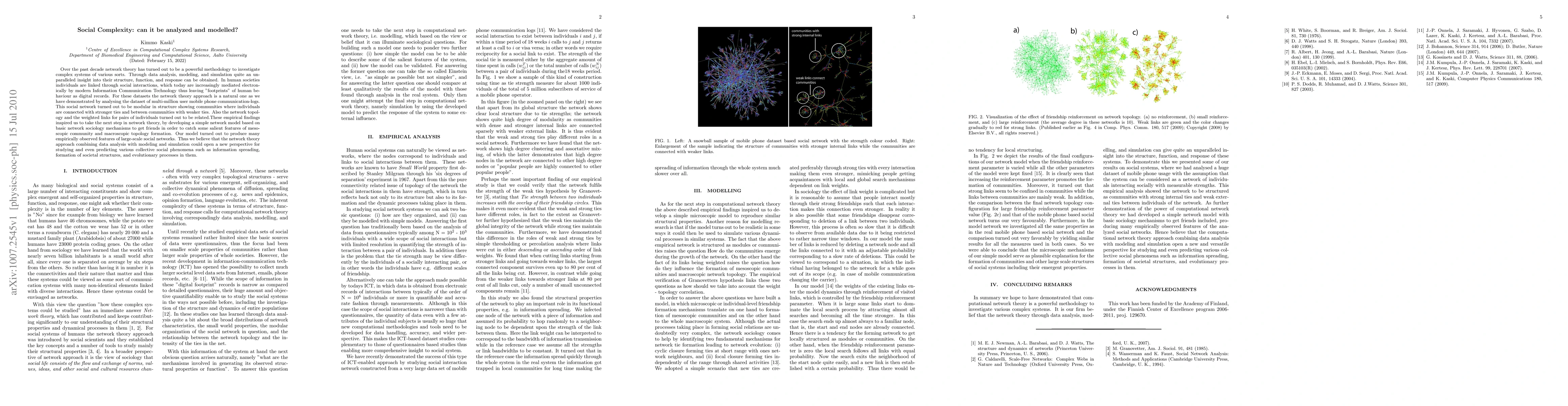 Over the past decade network theory has turned out to be a powerful methodology to investigate complex systems of various sorts. Through data analysis, modeling, and simulation quite an unparalleled insight into their structure, function, and response can be obtained. In human societies individuals are linked through social interactions, which today are increasingly mediated electronically by modern Information Communication Technology thus leaving "footprints" of human behaviour as digital records. For these datasets the network theory approach is a natural one as we have demonstrated by analysing the dataset of multi-million user mobile phone communication-logs. This social network turned out to be modular in structure showing communities where individuals are connected with stronger ties and between communities with weaker ties. Also the network topology and the weighted links for pairs of individuals turned out to be related.These empirical findings inspired us to take the next step in network theory, by developing a simple network model based on basic network sociology mechanisms to get friends in order to catch some salient features of mesoscopic community and macroscopic topology formation. Our model turned out to produce many empirically observed features of large-scale social networks. Thus we believe that the network theory approach combining data analysis with modeling and simulation could open a new perspective for studying and even predicting various collective social phenomena such as information spreading, formation of societal structures, and evolutionary processes in them.