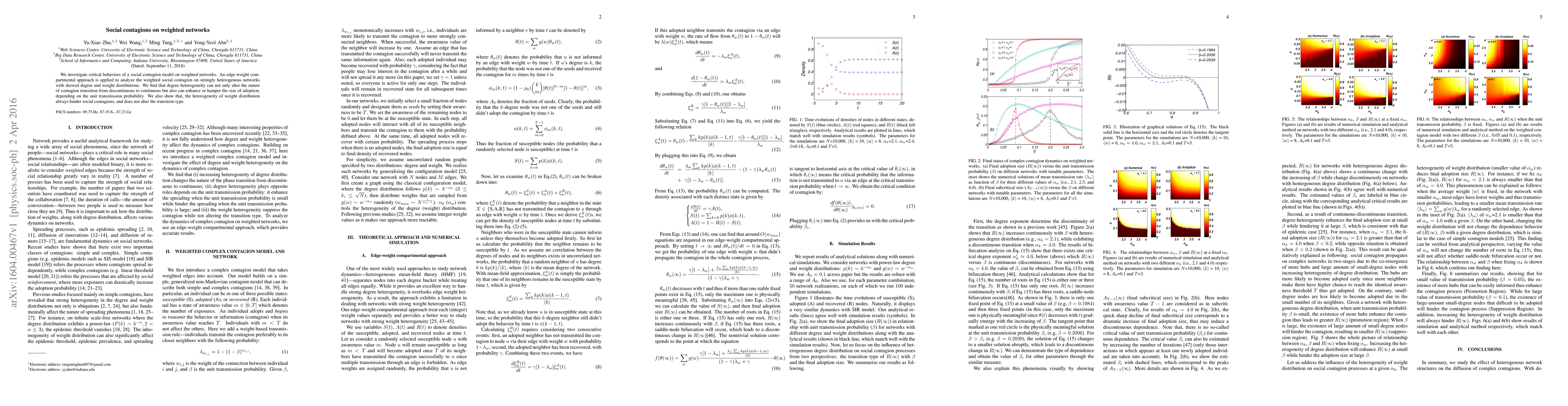We investigate critical behaviors of a social contagion model on weighted networks. An edge-weight compartmental approach is applied to analyze the weighted social contagion on strongly heterogenous networks with skewed degree and weight distributions. We find that degree heterogeneity can not only alter the nature of contagion transition from discontinuous to continuous but also can enhance or hamper the size of adoption, depending on the unit transmission probability. We also show that, the heterogeneity of weight distribution always hinder social contagions, and does not alter the transition type.